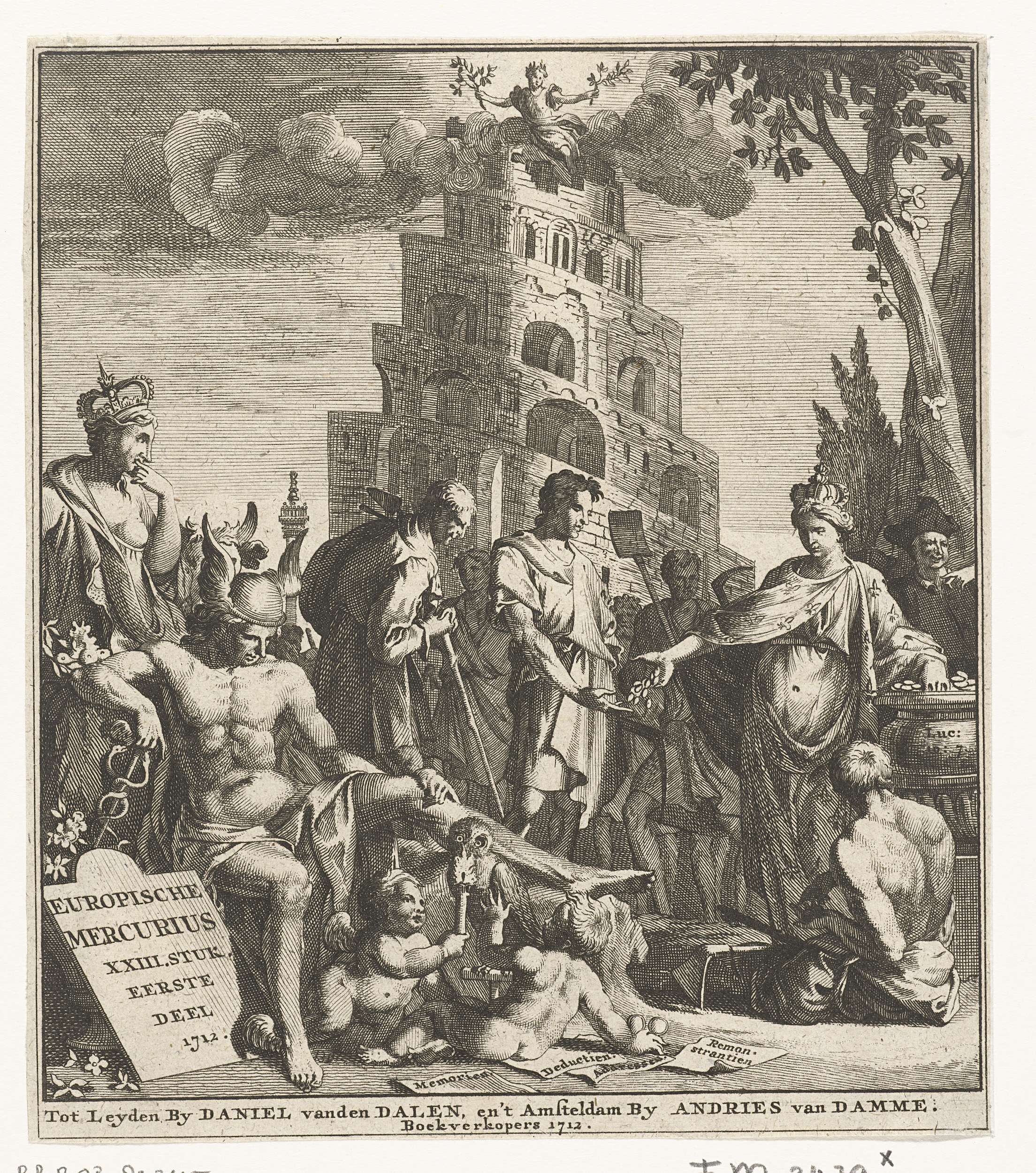 Titelpagina voor de Europische Mercurius van 1712, dl. XXIII, eerste deel. Op de voorgrond Mercurius, rechts financieert Frankrijk de bouw van een toren van Babel bekroond door de Vrede.