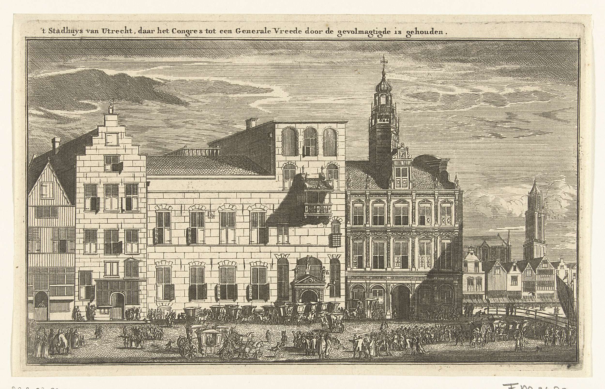 De vredesonderhandelingen in de gebouwen van het oude stadhuis van Utrecht, begonnen op 29 januari 1712. Rechts op de achtergrond de Dom. Op de voorgrond de aankomst van de koetsen van de onderhandelaars bij de toegang tot het stadhuis.