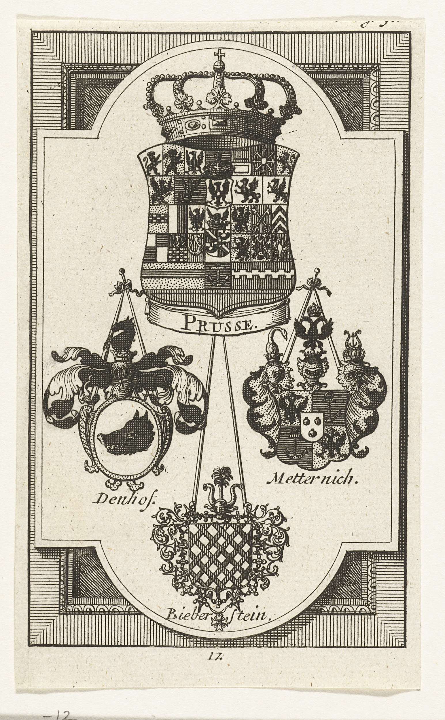 Wapens van de gevolmachtigden van Pruisen. Blad nummer 12 in een groep van 16 prenten met de wapens en namen van de gevolmachtigden bij de vredesonderhandelingen te Utrecht, 1712-1713.