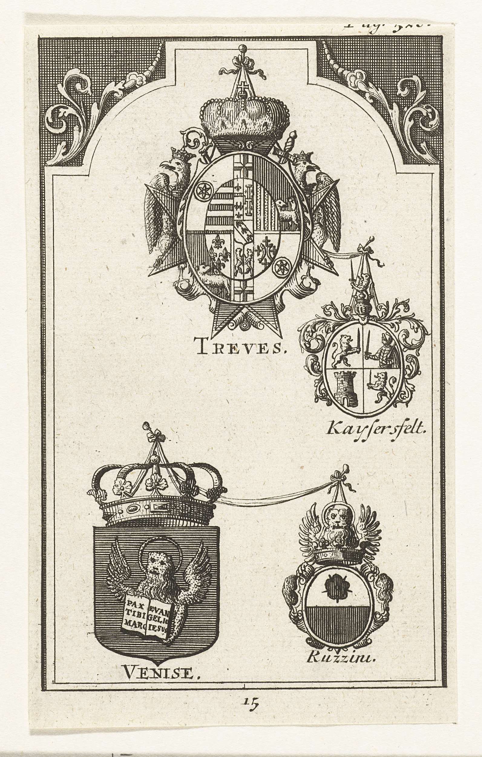 Wapens van de gevolmachtigden van Trier en Venetië. Blad nummer 15 in een groep van 16 prenten met de wapens en namen van de gevolmachtigden bij de vredesonderhandelingen te Utrecht, 1712-1713.