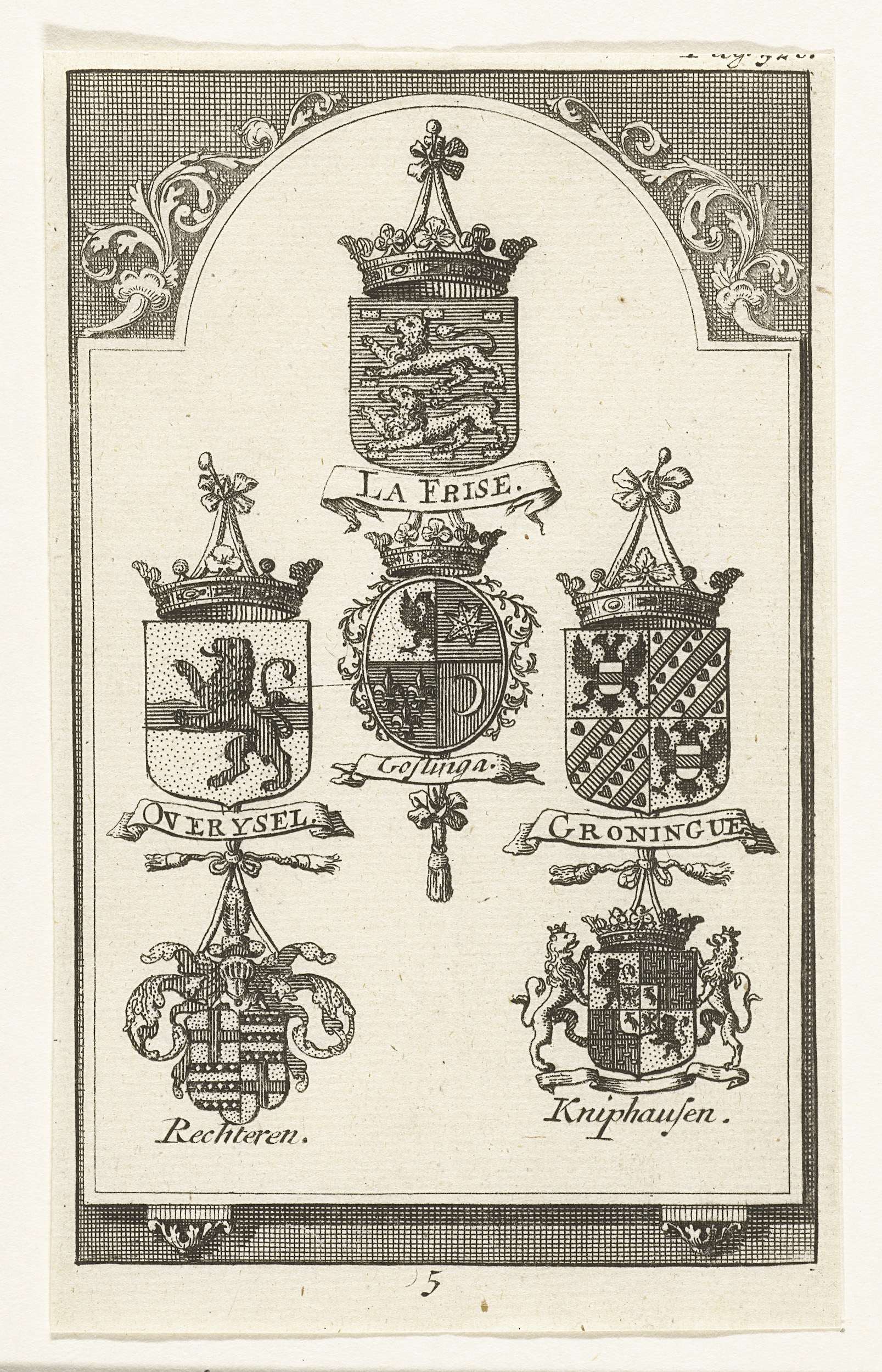 Wapens van de gevolmachtigden van Friesland, Groningen en Overijssel. Blad nummer 5 in een groep van 16 prenten met de wapens en namen van de gevolmachtigden bij de vredesonderhandelingen te Utrecht, 1712-1713.