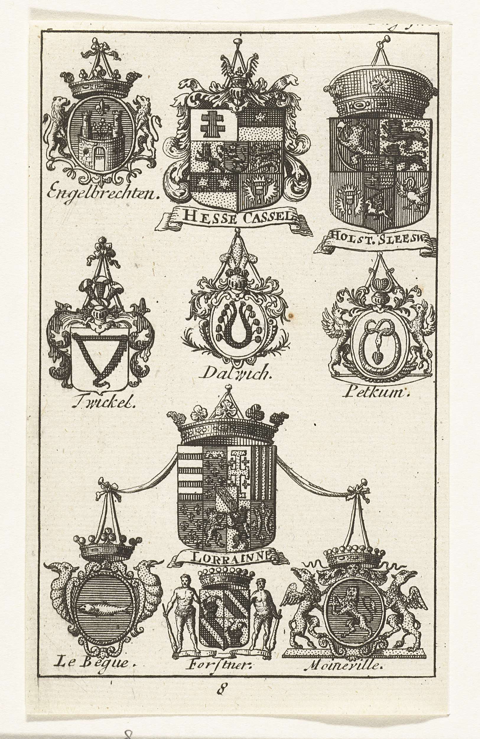 Wapens van de gevolmachtigden van Hessen-Kassel en Lotharingen. Blad nummer 8 in een groep van 16 prenten met de wapens en namen van de gevolmachtigden bij de vredesonderhandelingen te Utrecht, 1712-1713.
