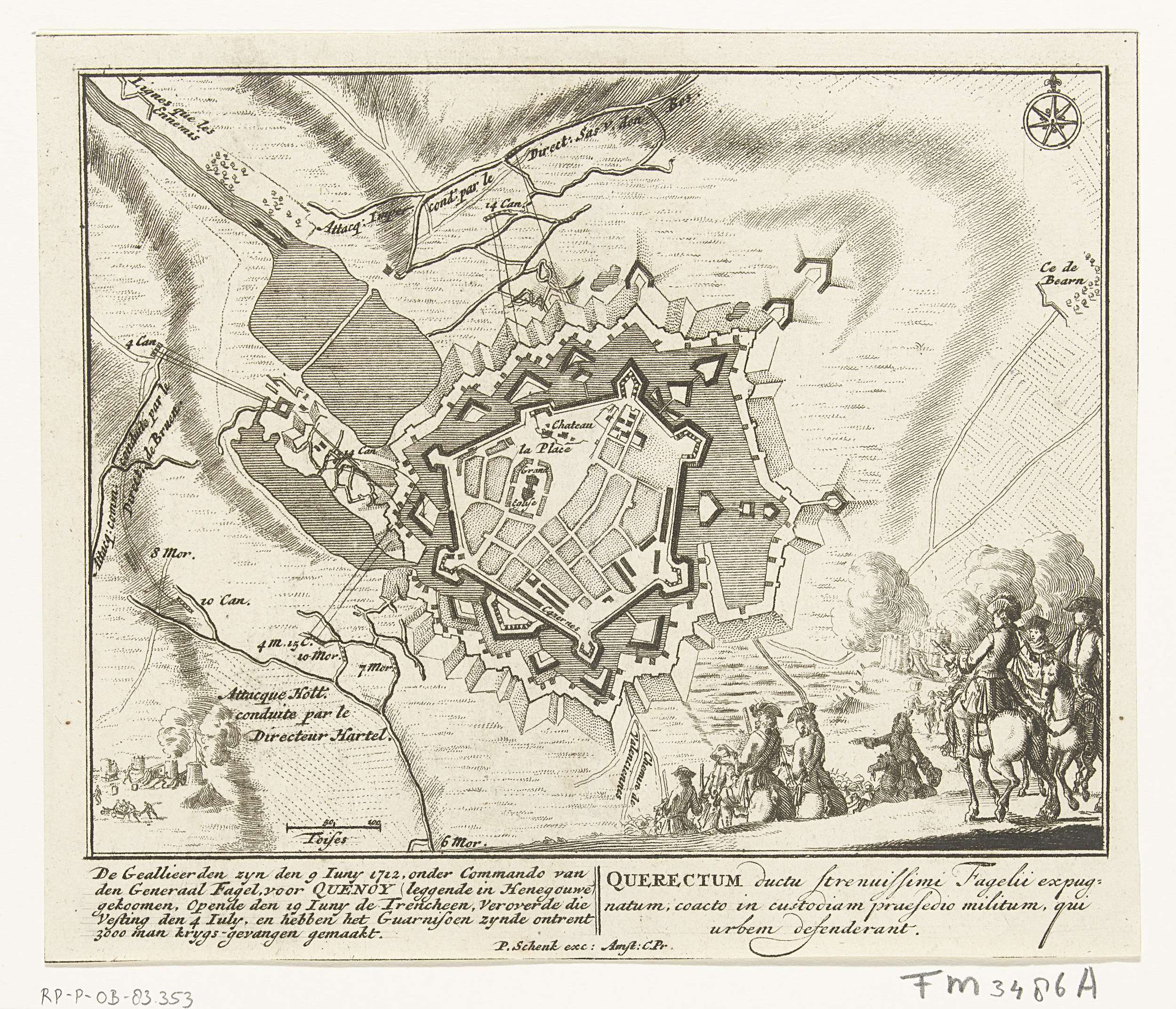 Kaart van le Quesnoy, ingenomen door de Geallieerden onder baron Fagel op 6 juli 1712, na een beleg begonnen op 8 juni. Met onderschriften in het Nederlands en Latijn. Fragment van een grote plaat met negen voorstellingen van gebeurtenissen uit het jaar 1712 van de Spaanse Successieoorlog.