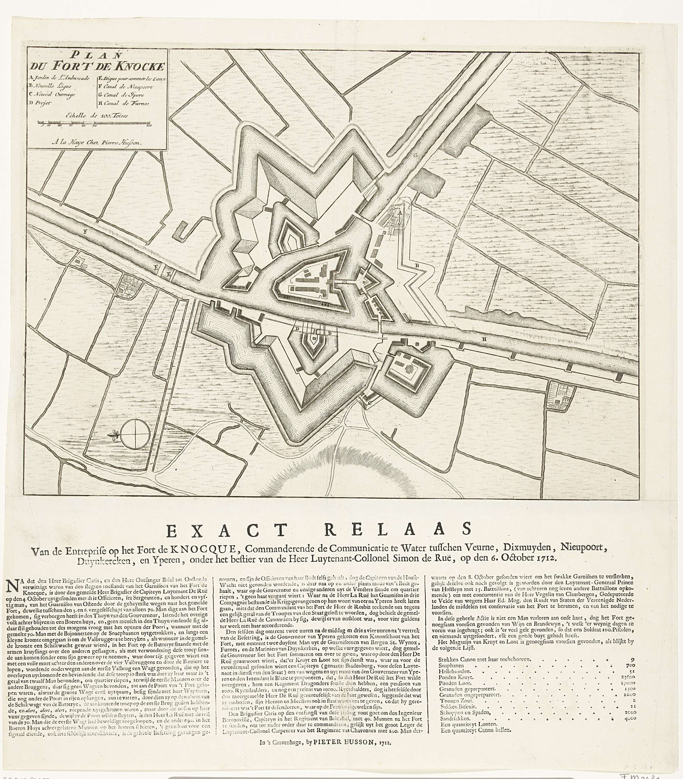 Vestingplattegrond van Fort Knokke, bij verrassing veroverd door de Hollanders onder Simon de Ruë, 6 oktober 1712. Rechtsboven een cartouche met titel, legenda A-H en een schaalstok: Echelle de 100 Toises. Op het blad onder de plaat het relaas van de actie in 3 kolommen.