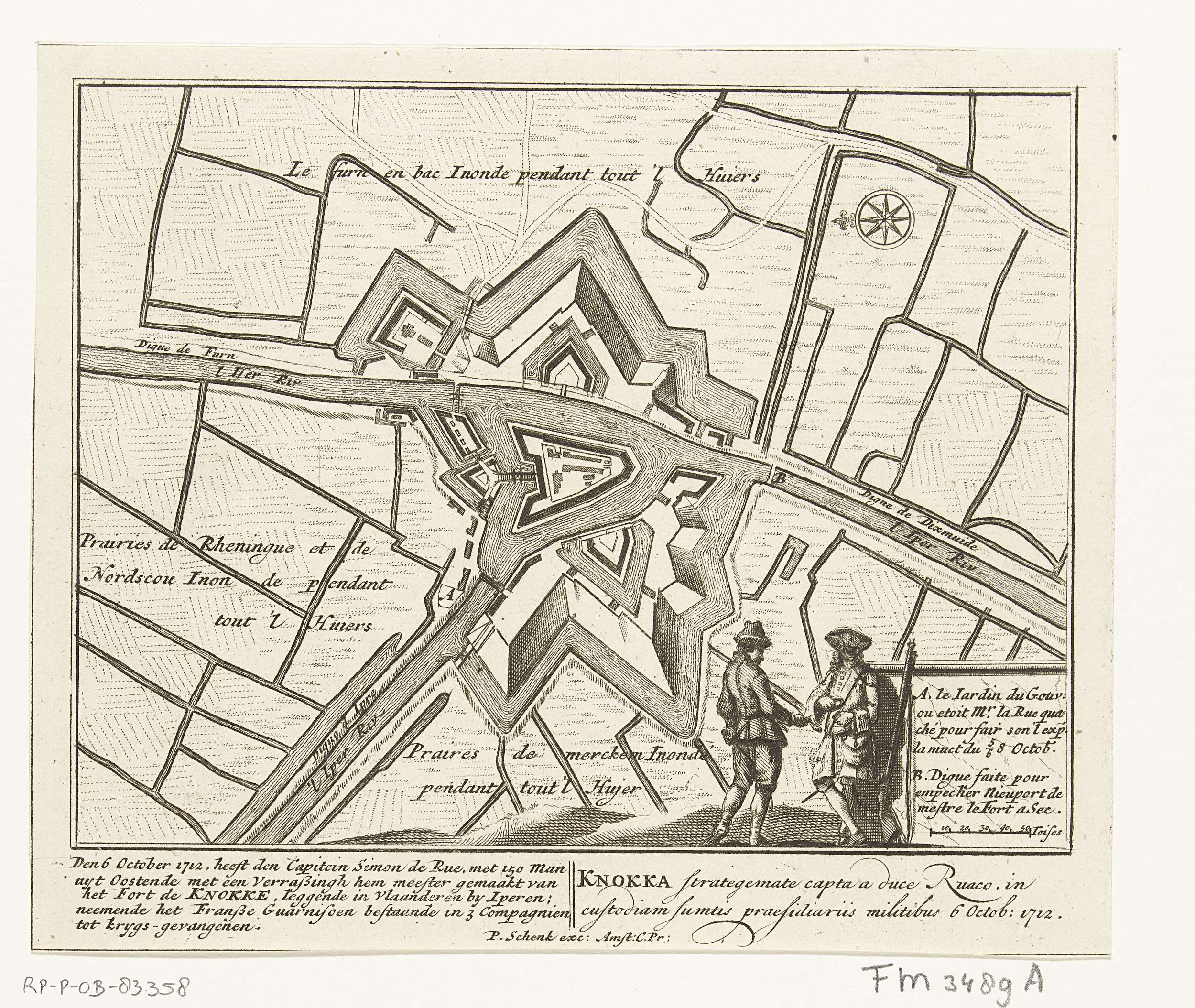 Plattegrond van Fort Knokke, bij verrassing veroverd door de Hollanders onder Simon de Ruë, 6 oktober 1712. Met onderschriften in het Nederlands en Latijn. Fragment van een grote plaat met negen voorstellingen van gebeurtenissen uit het jaar 1712 van de Spaanse Successieoorlog.