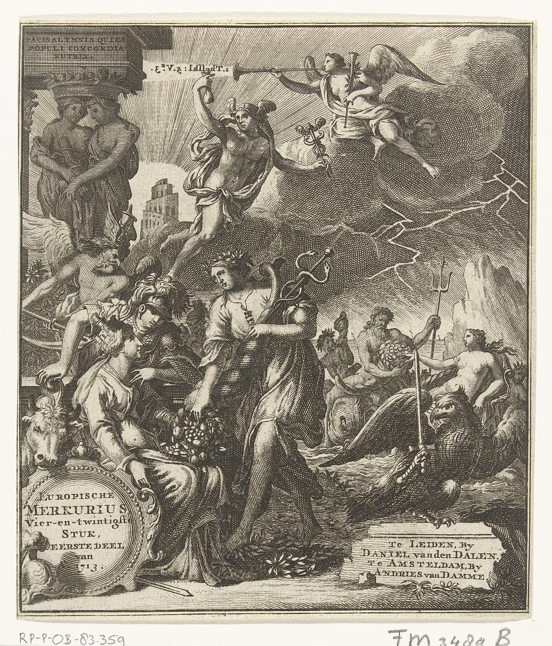Titelpagina voor de Europische Mercurius van 1713, dl. XXIV, eerste deel. Links vieren verschillende allegorische figuren de vrede, in de lucht Mercurius.