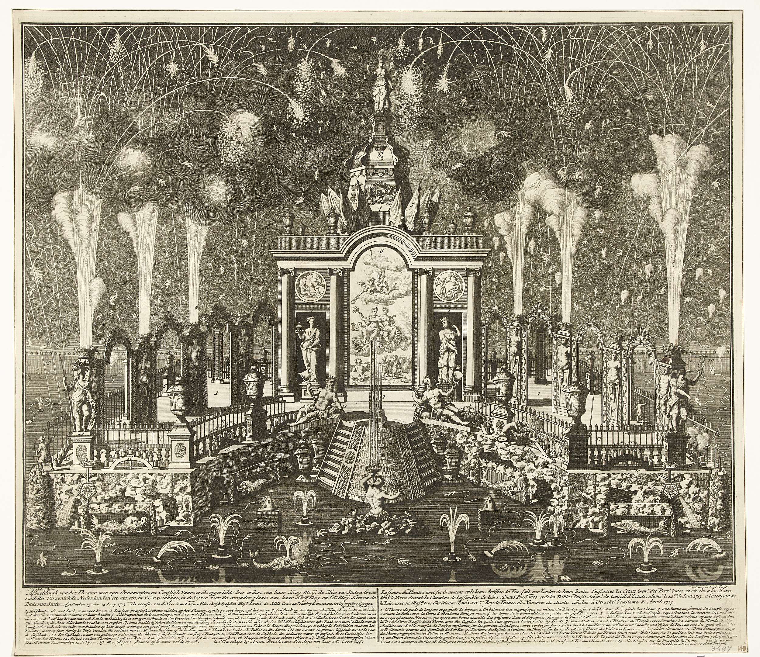 Stellage met vuurwerk afgestoken in opdracht van de Staten-Generaal op de Hofvijver te Den Haag bij de viering van de Vrede van Utrecht, 14 juni 1713. In de vijver is een tempel opgericht met een schilderij waarop Vrede en Overvloed tronen op de wolken en Mercurius een goede tijding brengt. Onderaan de titel en legenda ...