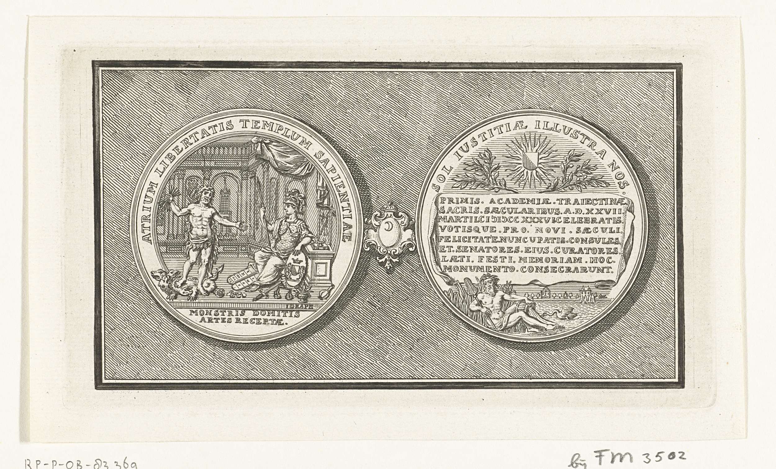 Penning vereerd aan de colleges van de Staten, stad, hof en predikanten bij het eeuwfeest van de Hogeschool te Utrecht in 1736. Voorzijde: Minerva met schild en speer leunend op voetstuk, waarop bijbel ligt met brandend lampje zit in grote zaal te midden van verschillende wetenschappelijke attributen, naast haar vertrapt Hercules met pijlenbundel vierkoppige draak; ...