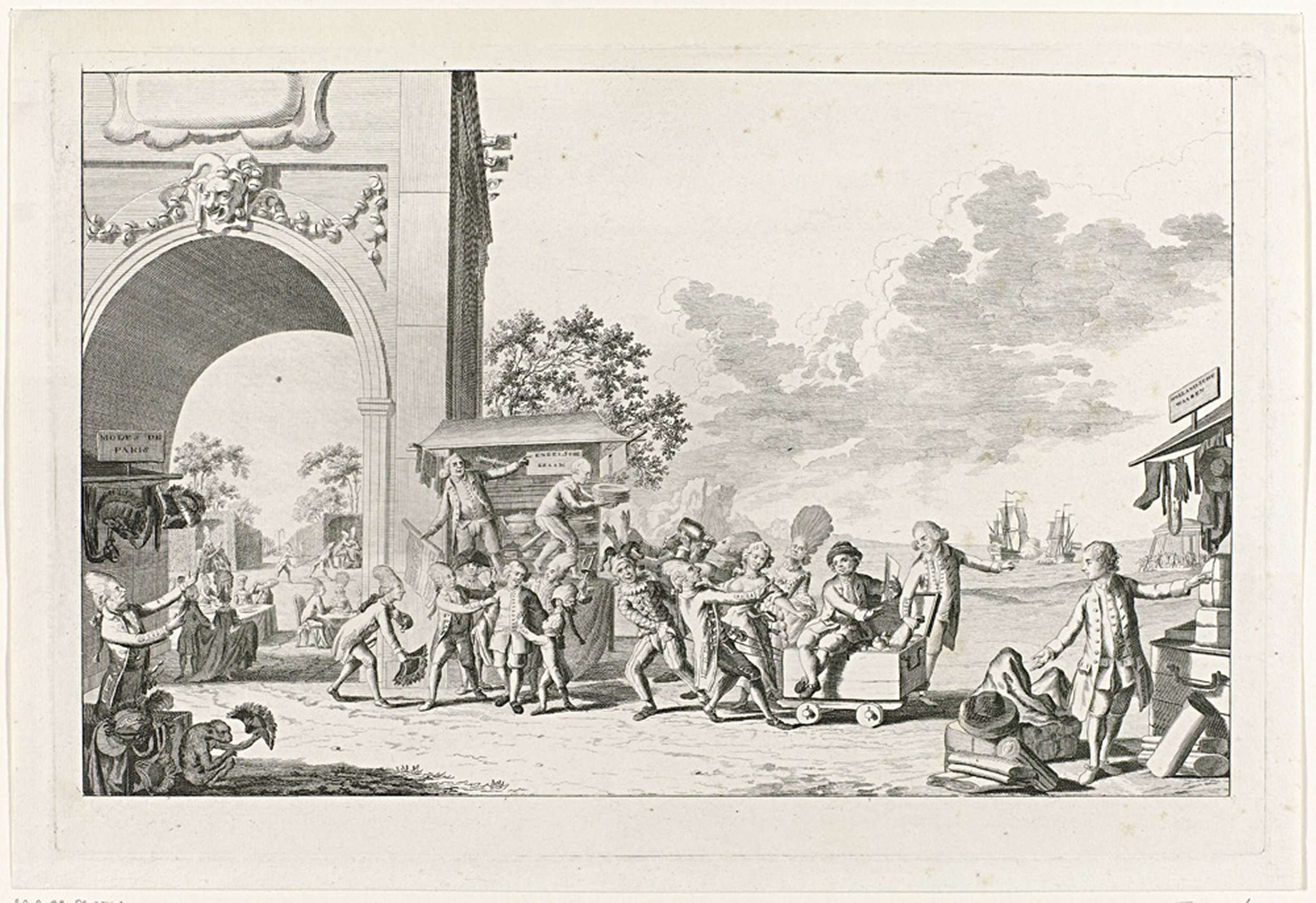 Spotprent op de Engelsgezindheid, wuftheid en vermaakzucht van het jonge Holland, 1780. Een jonge rijke Hollander gezeten op een geldkist wijst de kraam met de Hollandse waren af en laat zich naar de Engelse Kraam en de Franse Kraam met de Modes de Paris rijden. Zie ook de pendant. Bij de prent behoort een afzonderlijk ...