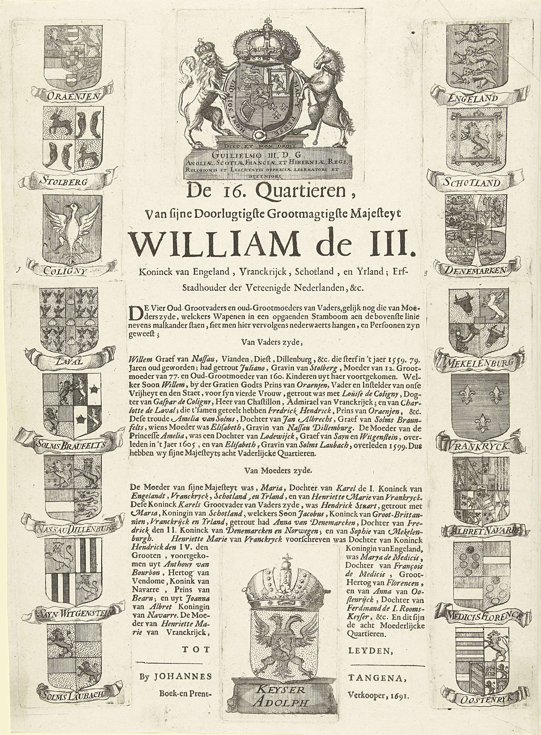 De zestien kwartieren van Willem III. Links de acht kwartieren van zijn vaders zijde. Rechts de acht kwartieren van zijn moeders zijde. Midden boven zijn wapen met een kroon, gedecoreerd met de Kousenband en het devies van de Orde van de Kousenband. Midden onder het wapen van keizer Adolf. In het midden kolommen met Nederlandse ...