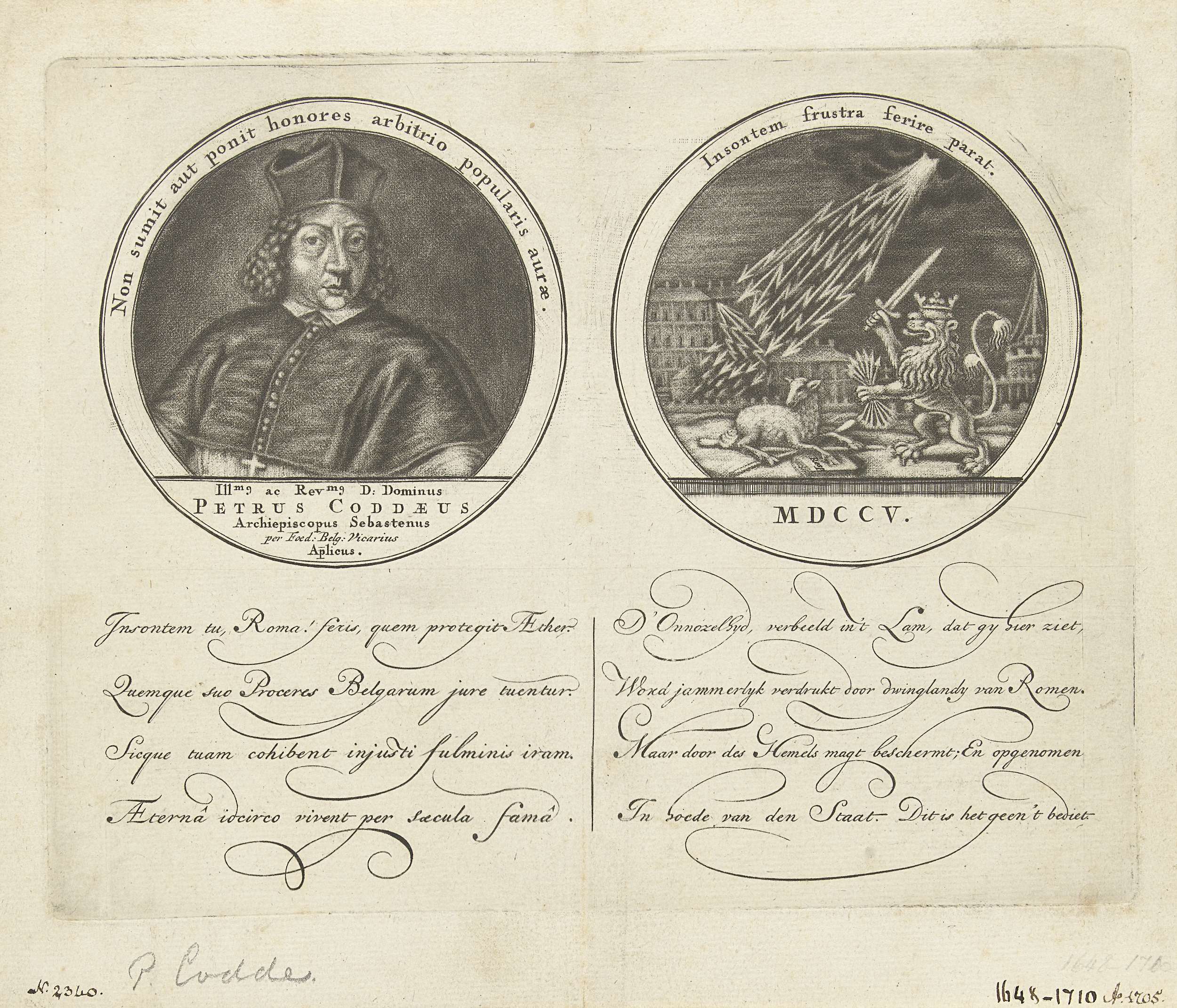 Zilveren penning uit 1705 ter ere van Petrus Codde met een een portret en op de keerzijde een allegorische voorstelling waarin de Nederlandse Leeuw met Gods hulp het Lam beschermt tegen de bliksemschichten uit het Vatikaan. In het onderschrift twee verzen van 4 regels in het Latijn en Nederlands.