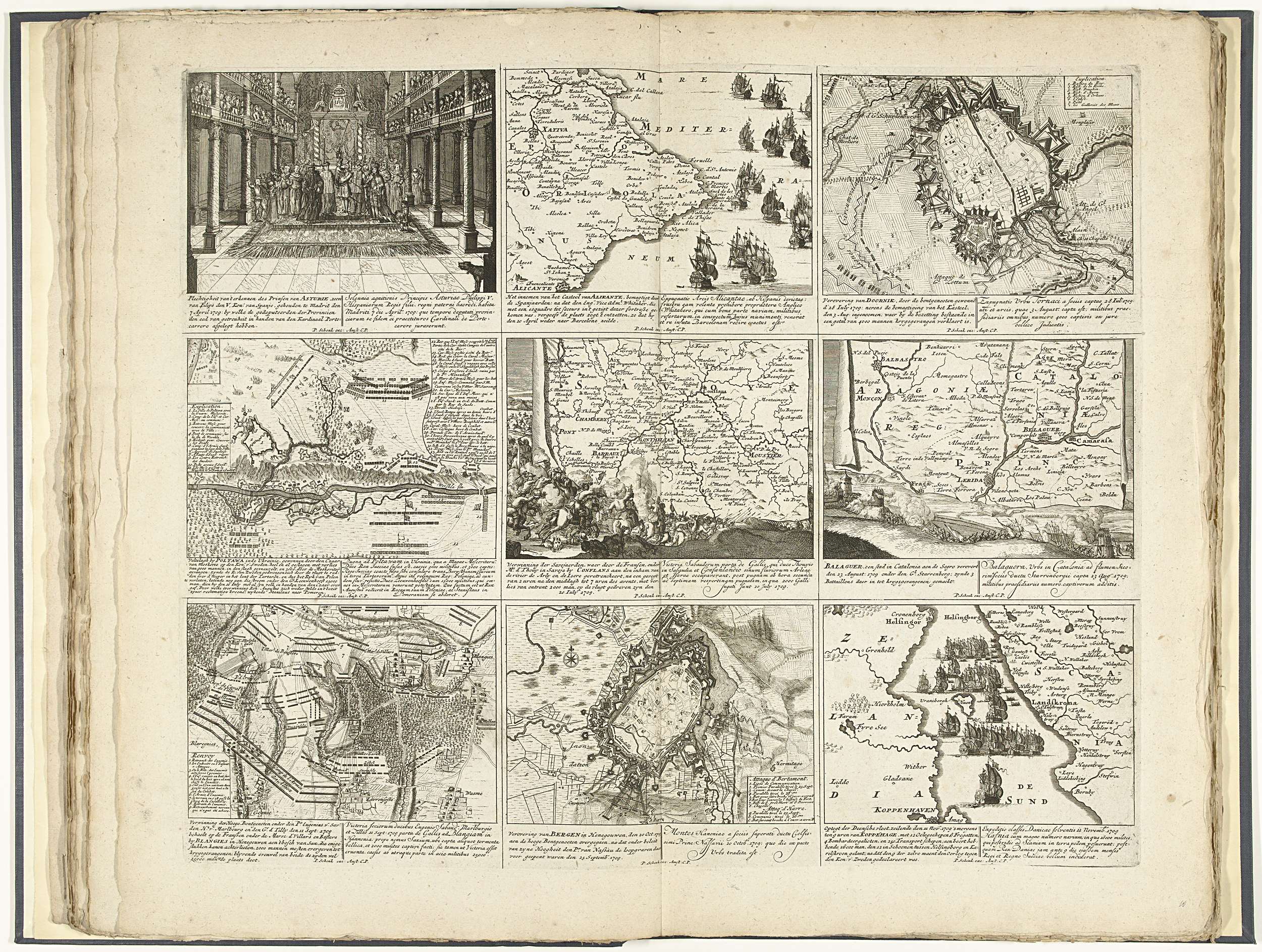 Blad met negen voorstellingen van gebeurtenissen uit het jaar 1709 van de Spaanse Successieoorlog en van plattegronden van versterkte steden. Opschriften in de voorstelling in het Nederlands en Latijn. Plaat 9 in het prentwerk met de gebundelde reeks van 33 platen met voorstellingen (het merendeel verdeeld in 9 kleinere scènes) van gebeurtenissen uit de jaren ...