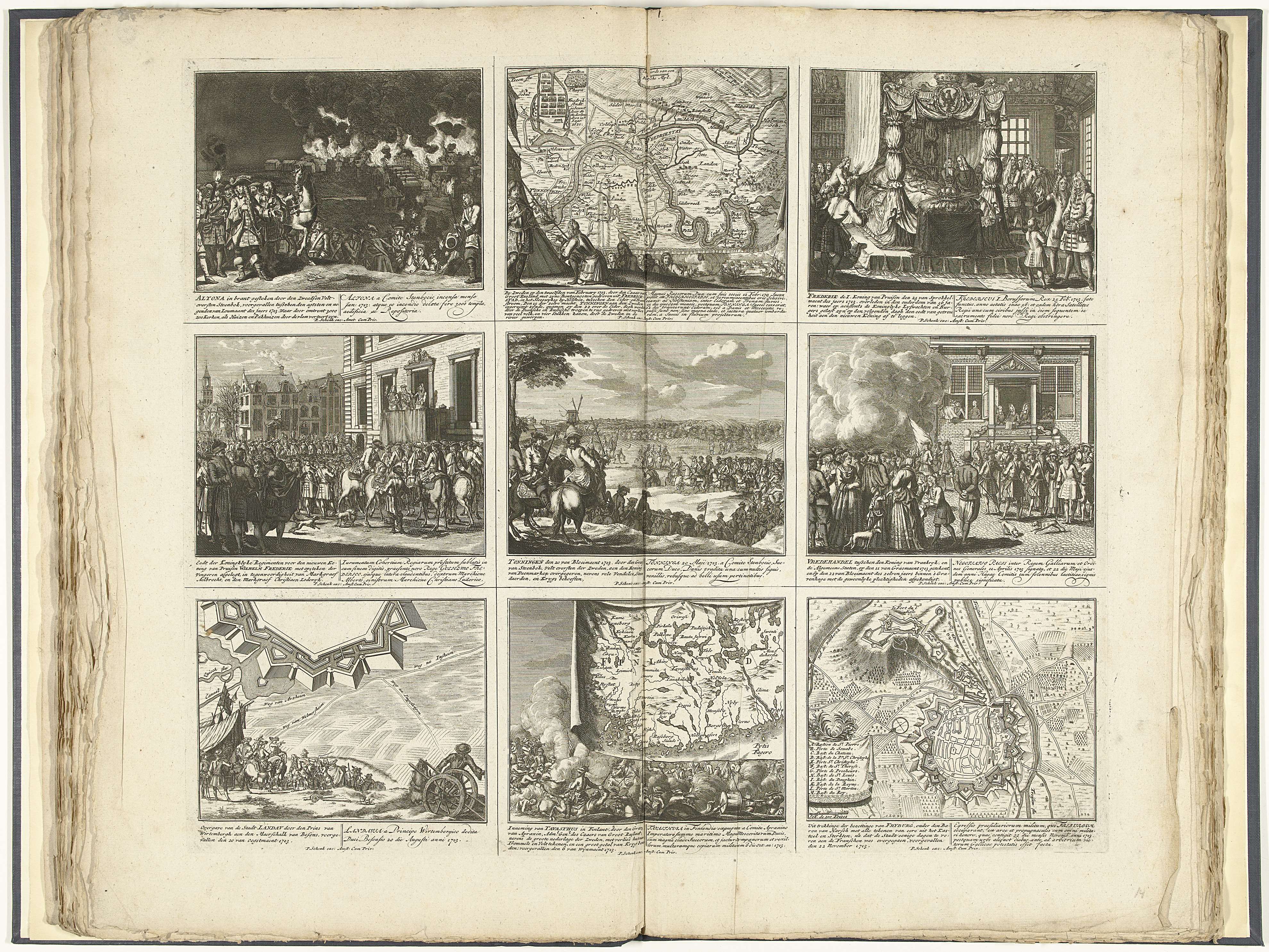 Blad met negen voorstellingen van gebeurtenissen uit het jaar 1713 van de Spaanse Successieoorlog en van plattegronden van versterkte steden. Opschriften in de voorstelling in het Nederlands en Latijn. Plaat 13 in het prentwerk met de gebundelde reeks van 33 platen met voorstellingen (het merendeel verdeeld in 9 kleinere scènes) van gebeurtenissen uit de jaren ...