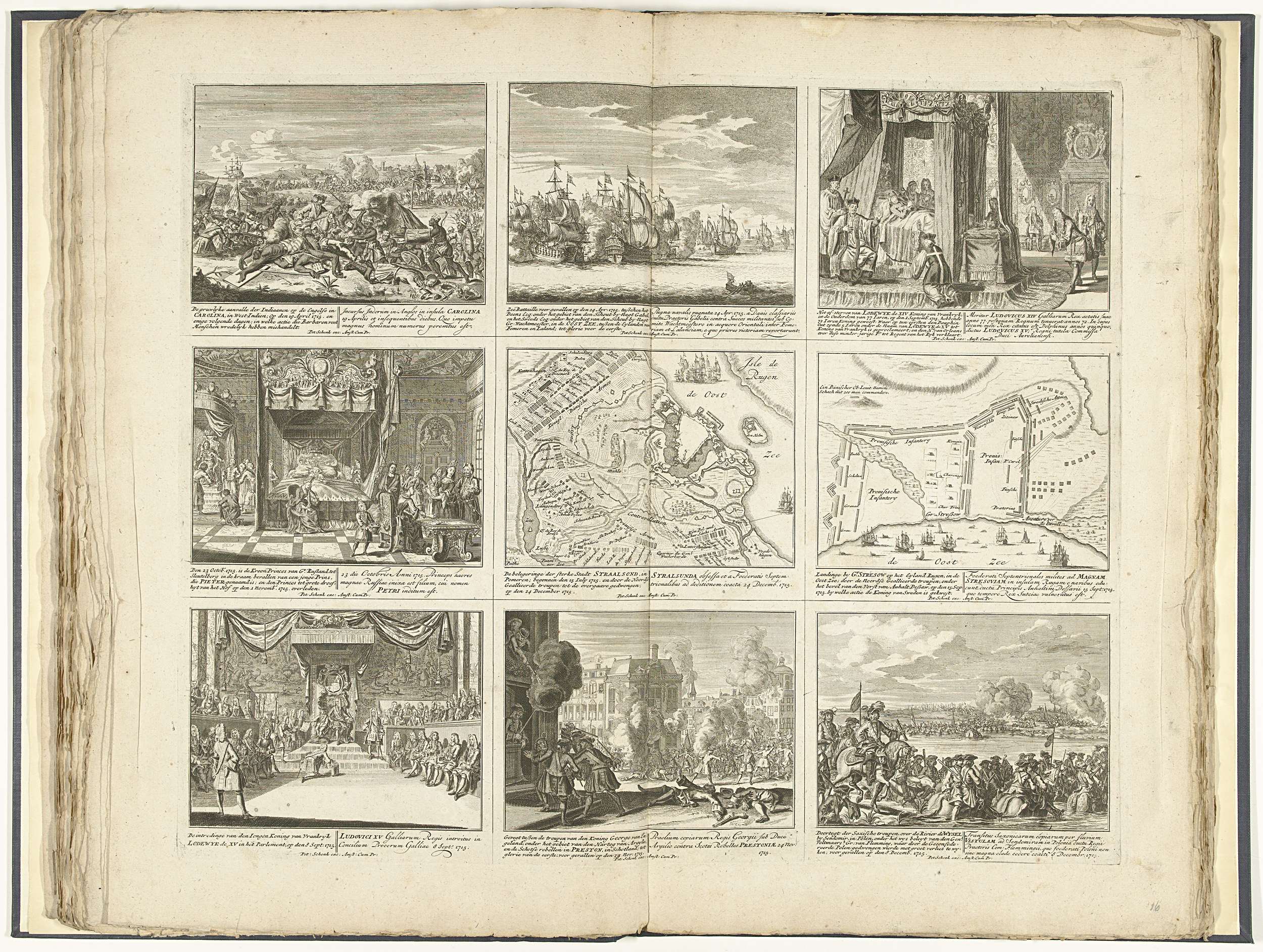 Blad met negen voorstellingen van gebeurtenissen uit het jaar 1715 en plattegronden van versterkte steden. Opschriften in de voorstelling in het Nederlands en Latijn. Plaat 15 in het prentwerk met de gebundelde reeks van 33 platen met voorstellingen (het merendeel verdeeld in 9 kleinere scènes) van gebeurtenissen uit de jaren 1700-1727 van de Spaanse Successieoorlog ...