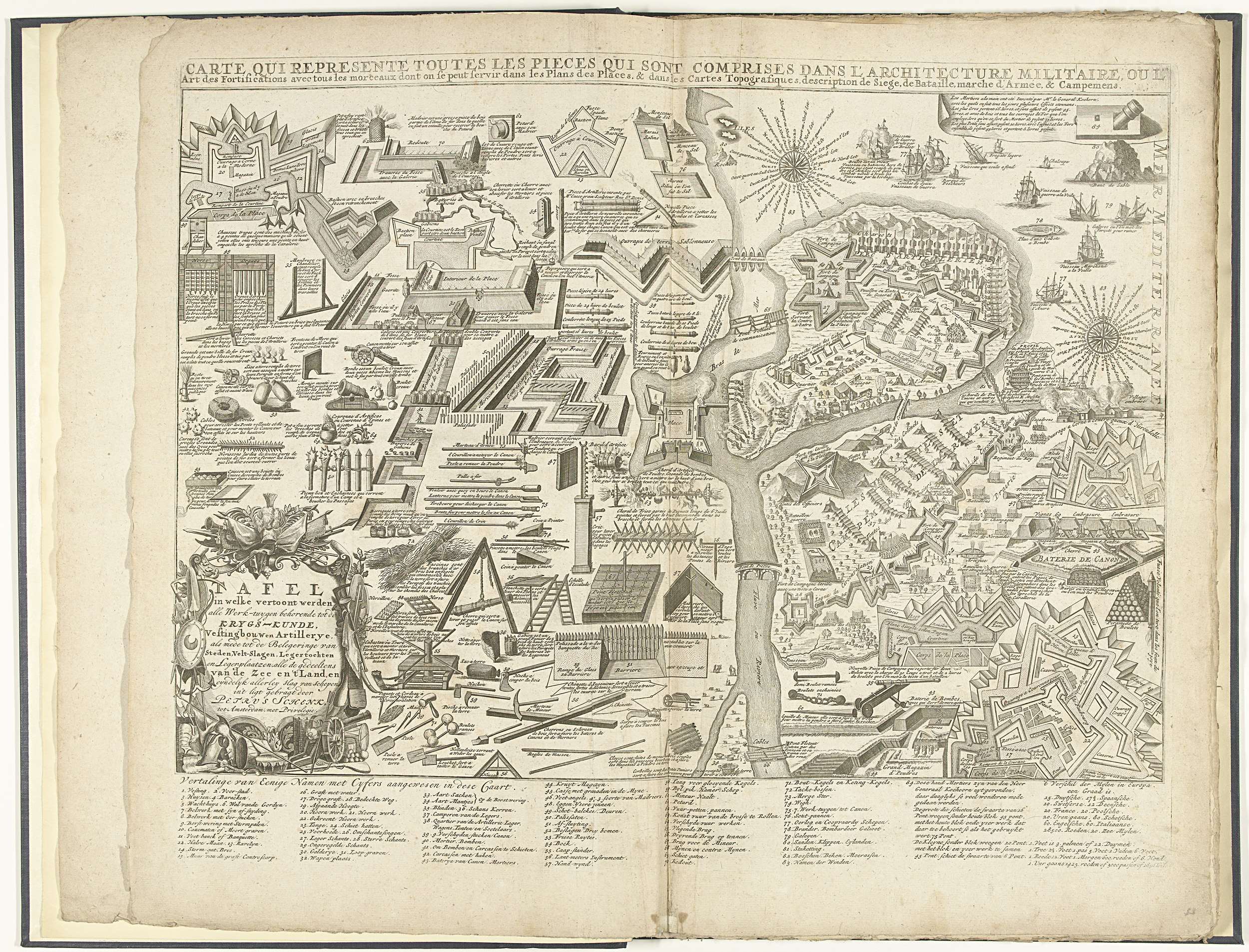 Blad met een overzicht van allerlei soorten werktuigen en wapens gebruikt in de vestingbouw, diagrammen en doorsneden van vestingen, typen legerkampen, soorten schepen etc, 1703. Opschriften in de voorstelling in het Frans, onderaan de legenda 1-84 in het Nederlands. Plaat 1 in het prentwerk met de gebundelde reeks van 33 platen met voorstellingen (het merendeel ...