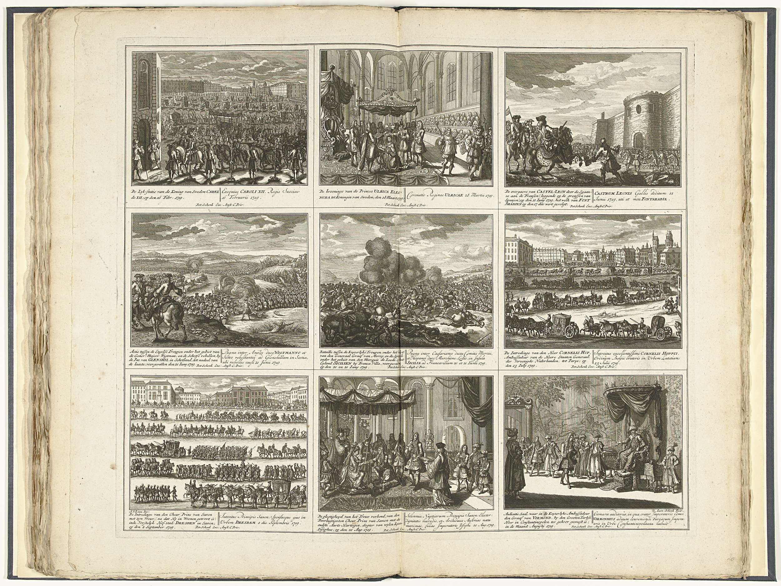 Blad met negen voorstellingen van gebeurtenissen uit het jaar 1719. Opschriften in de voorstelling in het Nederlands en Latijn. Plaat 19 in het prentwerk met de gebundelde reeks van 33 platen met voorstellingen (het merendeel verdeeld in 9 kleinere scènes) van gebeurtenissen uit de jaren 1700-1727 van de Spaanse Successieoorlog en de jaren daarna, kaarten ...