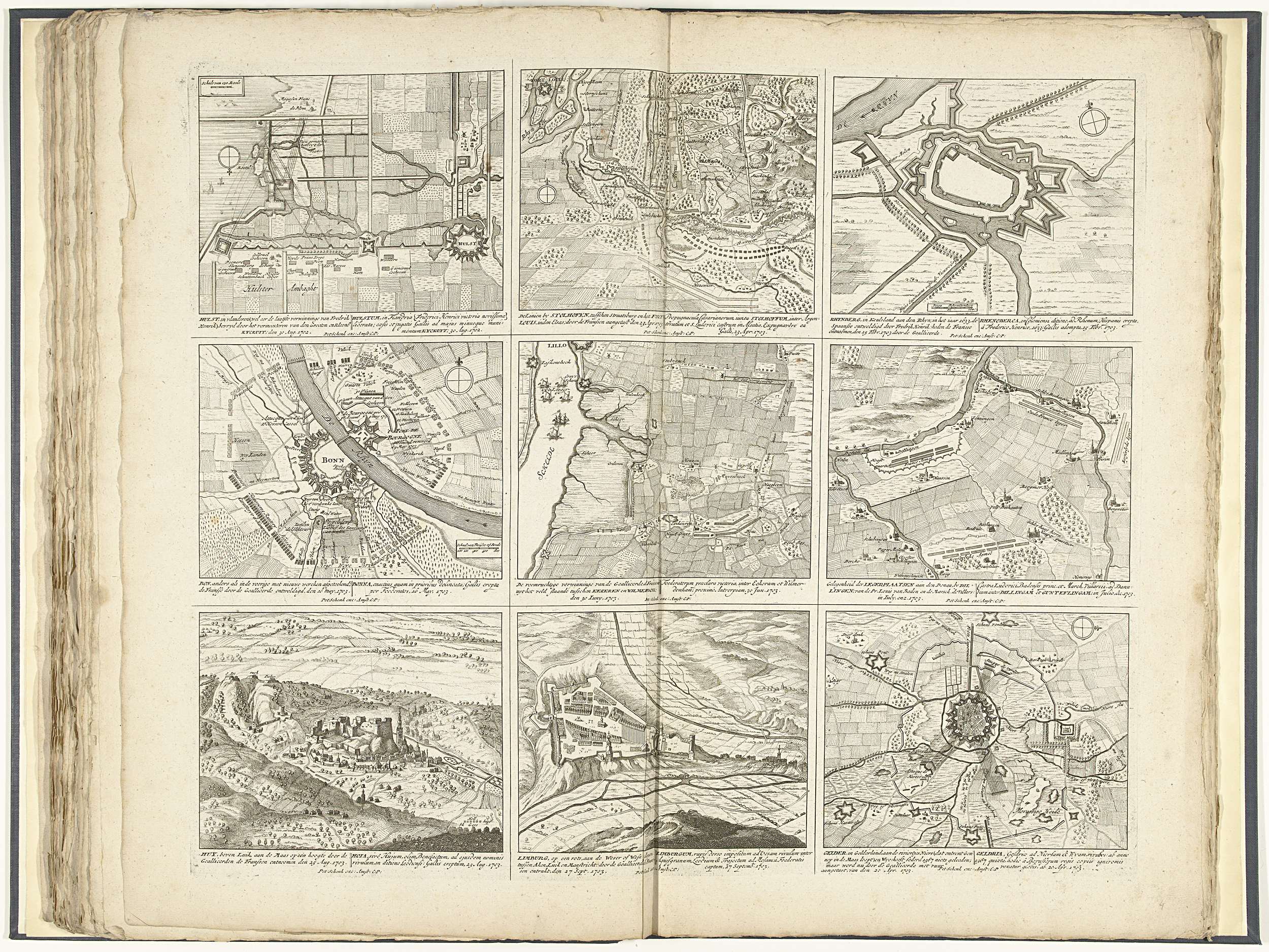 Blad met negen voorstellingen van gebeurtenissen uit de jaren 1702-1703 van de Spaanse Successieoorlog en van plattegronden van versterkte steden. Opschriften in de voorstelling in het Nederlands en Latijn. Plaat 23 in het prentwerk met de gebundelde reeks van 33 platen met voorstellingen (het merendeel verdeeld in 9 kleinere scènes) van gebeurtenissen uit de jaren ...