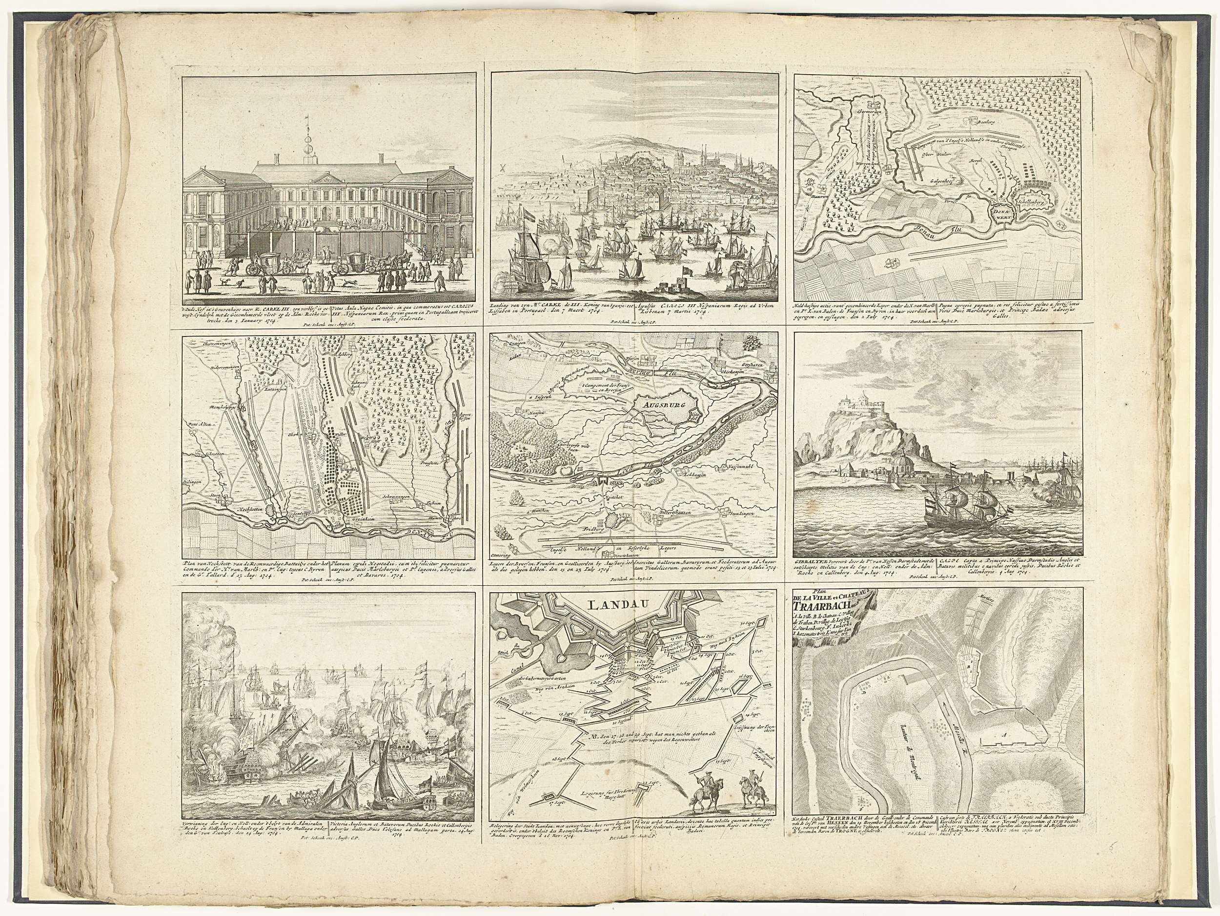 Blad met negen voorstellingen van gebeurtenissen uit het jaar 1704 van de Spaanse Successieoorlog en van plattegronden van versterkte steden. Opschriften in de voorstelling in het Nederlands en Latijn. Plaat 24 in het prentwerk met de gebundelde reeks van 33 platen met voorstellingen (het merendeel verdeeld in 9 kleinere scènes) van gebeurtenissen uit de jaren ...