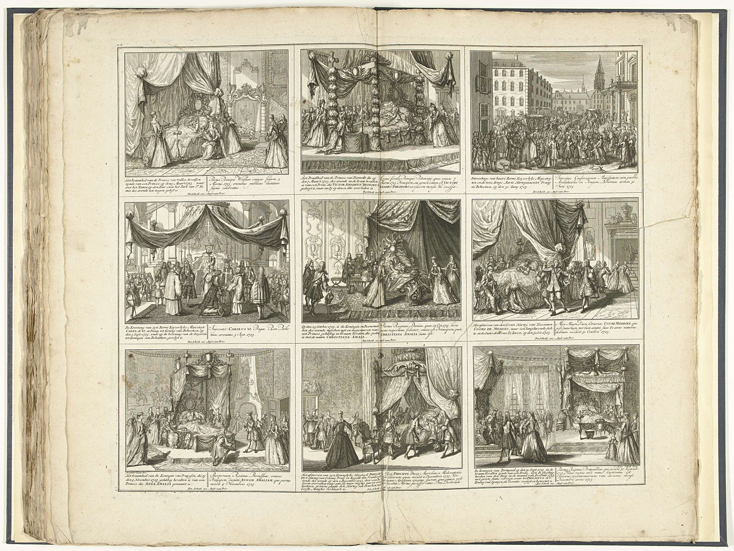 Blad met negen voorstellingen van gebeurtenissen uit het jaar 1723. Opschriften in de voorstelling in het Nederlands en Latijn. Plaat 29 in het prentwerk met de gebundelde reeks van 33 platen met voorstellingen (het merendeel verdeeld in 9 kleinere scènes) van gebeurtenissen uit de jaren 1700-1727 van de Spaanse Successieoorlog en de jaren daarna, kaarten ...