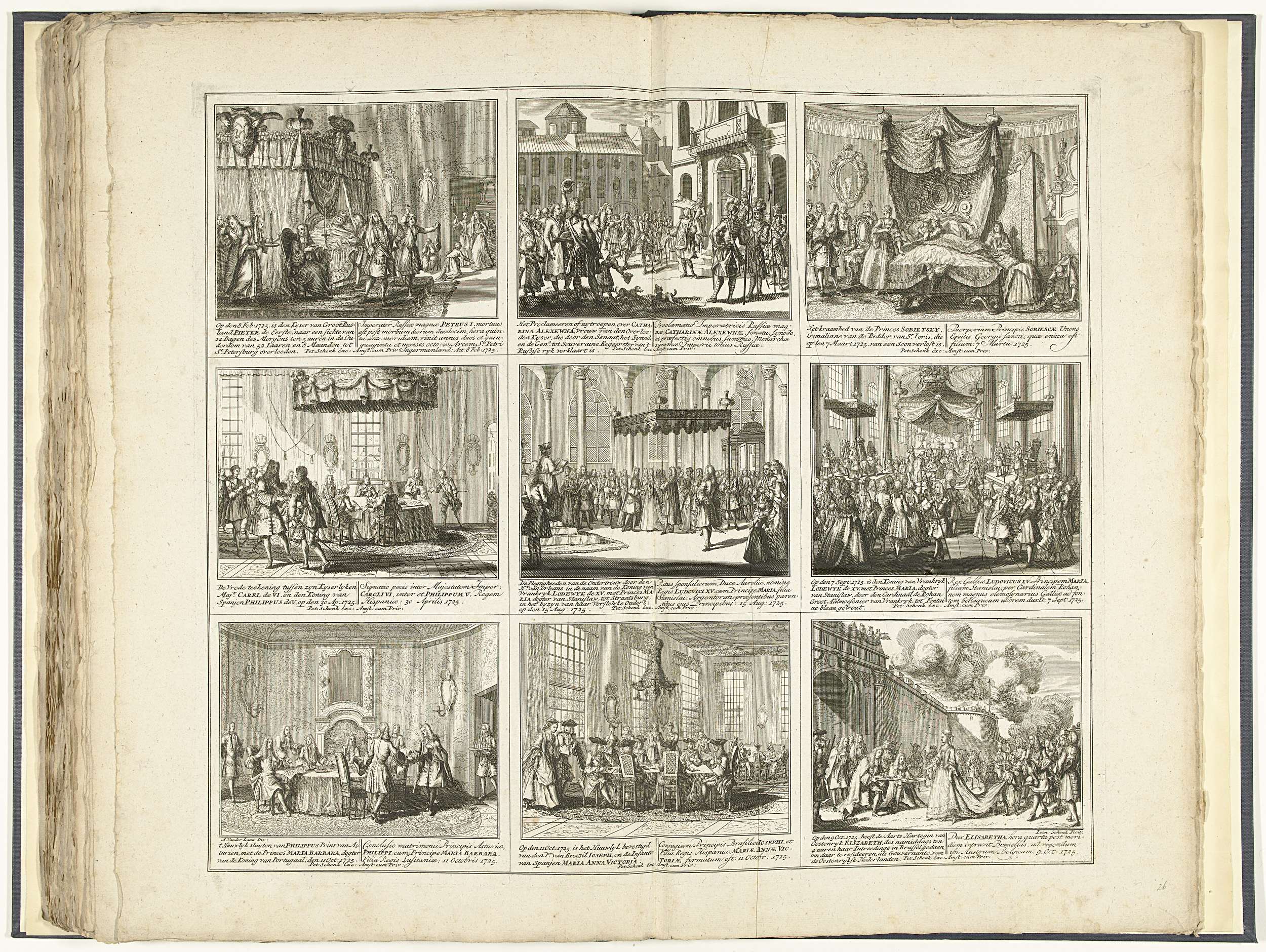 Blad met negen voorstellingen van gebeurtenissen uit het jaar 1725. Opschriften in de voorstelling in het Nederlands en Latijn. Plaat 31 in het prentwerk met de gebundelde reeks van 33 platen met voorstellingen (het merendeel verdeeld in 9 kleinere scènes) van gebeurtenissen uit de jaren 1700-1727 van de Spaanse Successieoorlog en de jaren daarna, kaarten ...