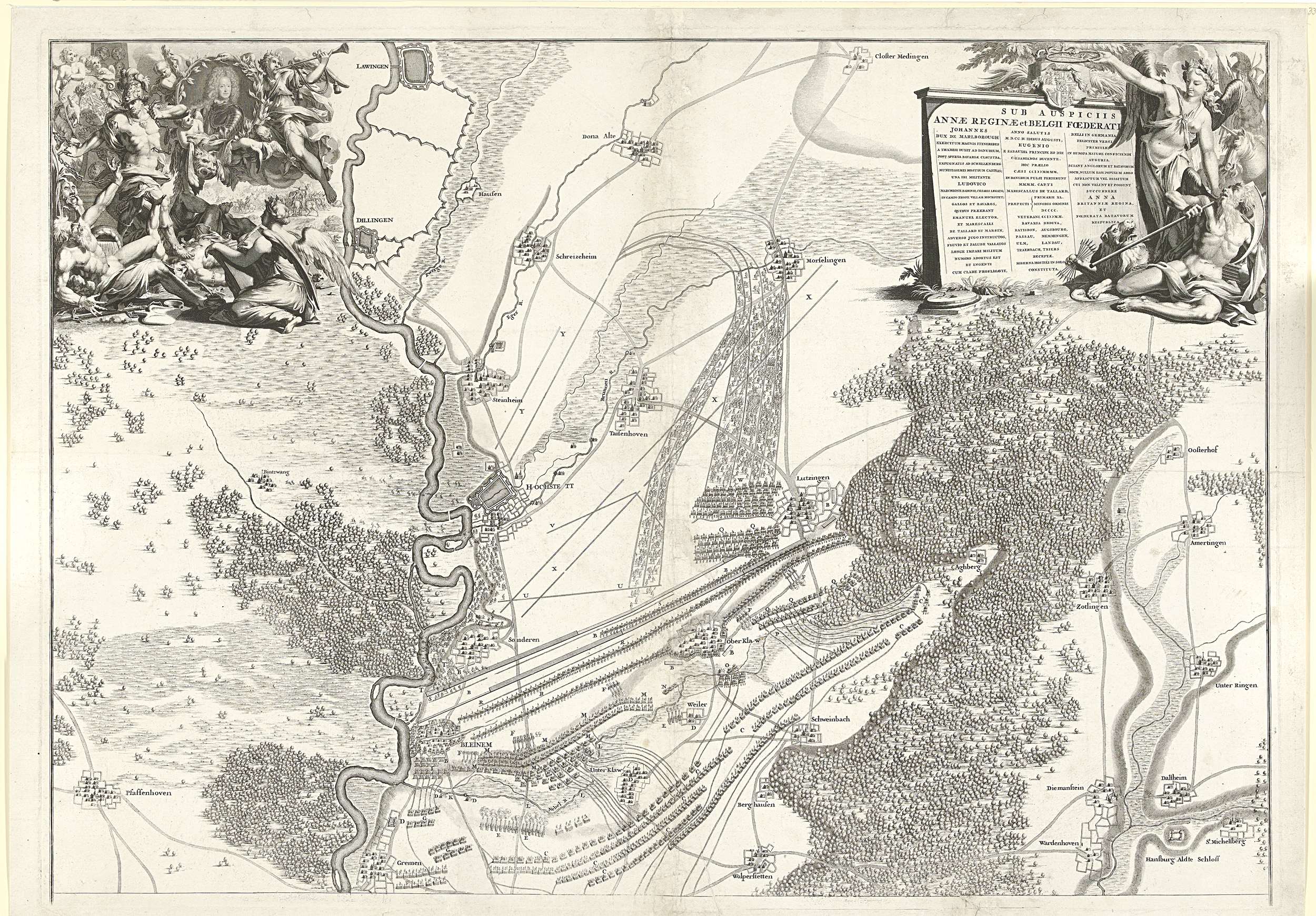 Bovenste helft van een grote kaart van de Slag bij Höchstädt (Slag bij Blenheim) op 13 augustus 1704 waarbij de Geallieerden onder de hertog van Marlborough en de prins van Savoye een overwinning behaalden op de Franse en Beierse troepen. Linksboven een allegorisch viget met Mars die zich van zijn ketens bevrijdt, met het portret ...