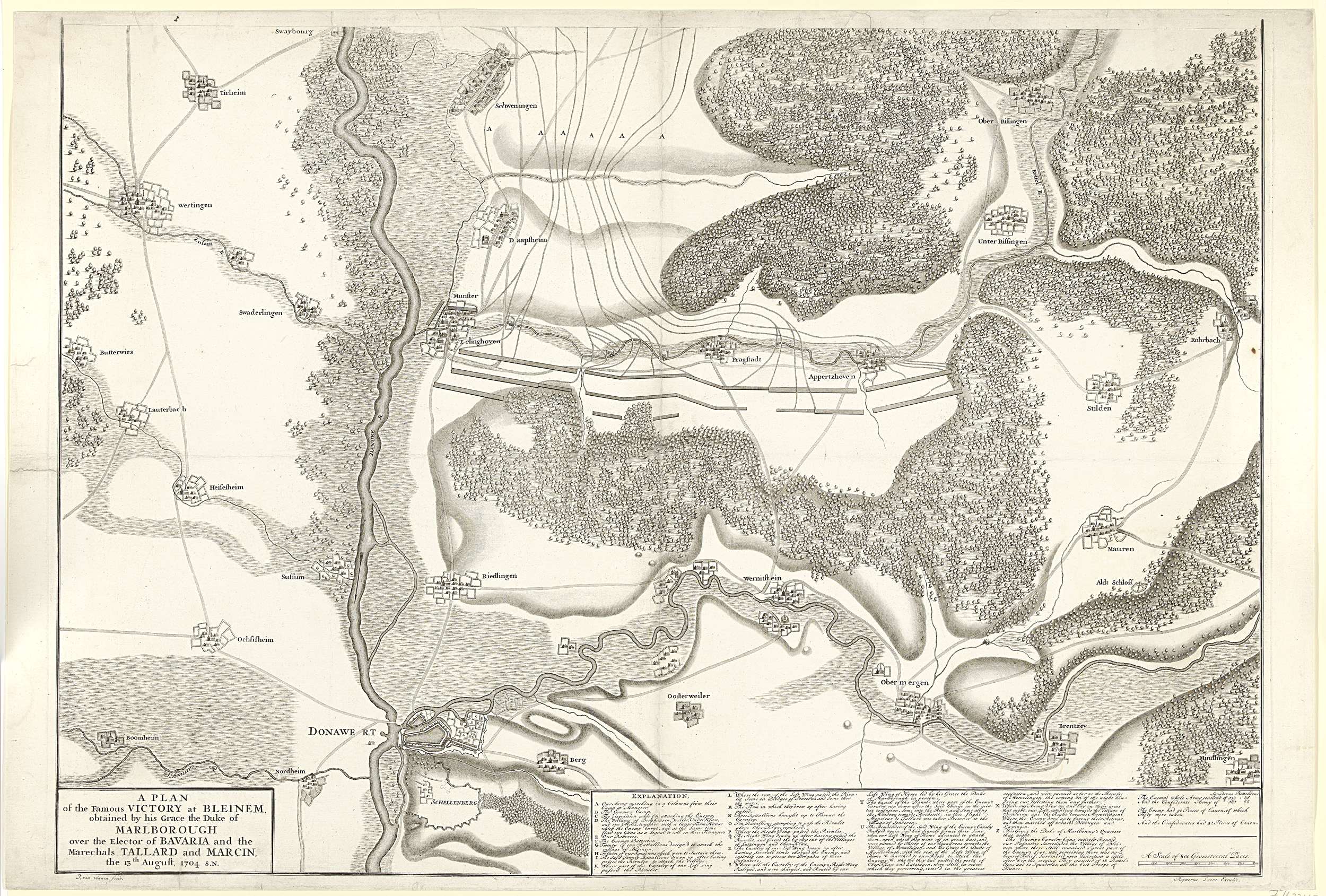 Onderste helft van een grote kaart van de Slag bij Höchstädt (Slag bij Blenheim) op 13 augustus 1704 waarbij de Geallieerden onder de hertog van Marlborough en de prins van Savoye een overwinning behaalden op de Franse en Beierse troepen. Onderaan de verklaring van de letters A-Z in het Engels.