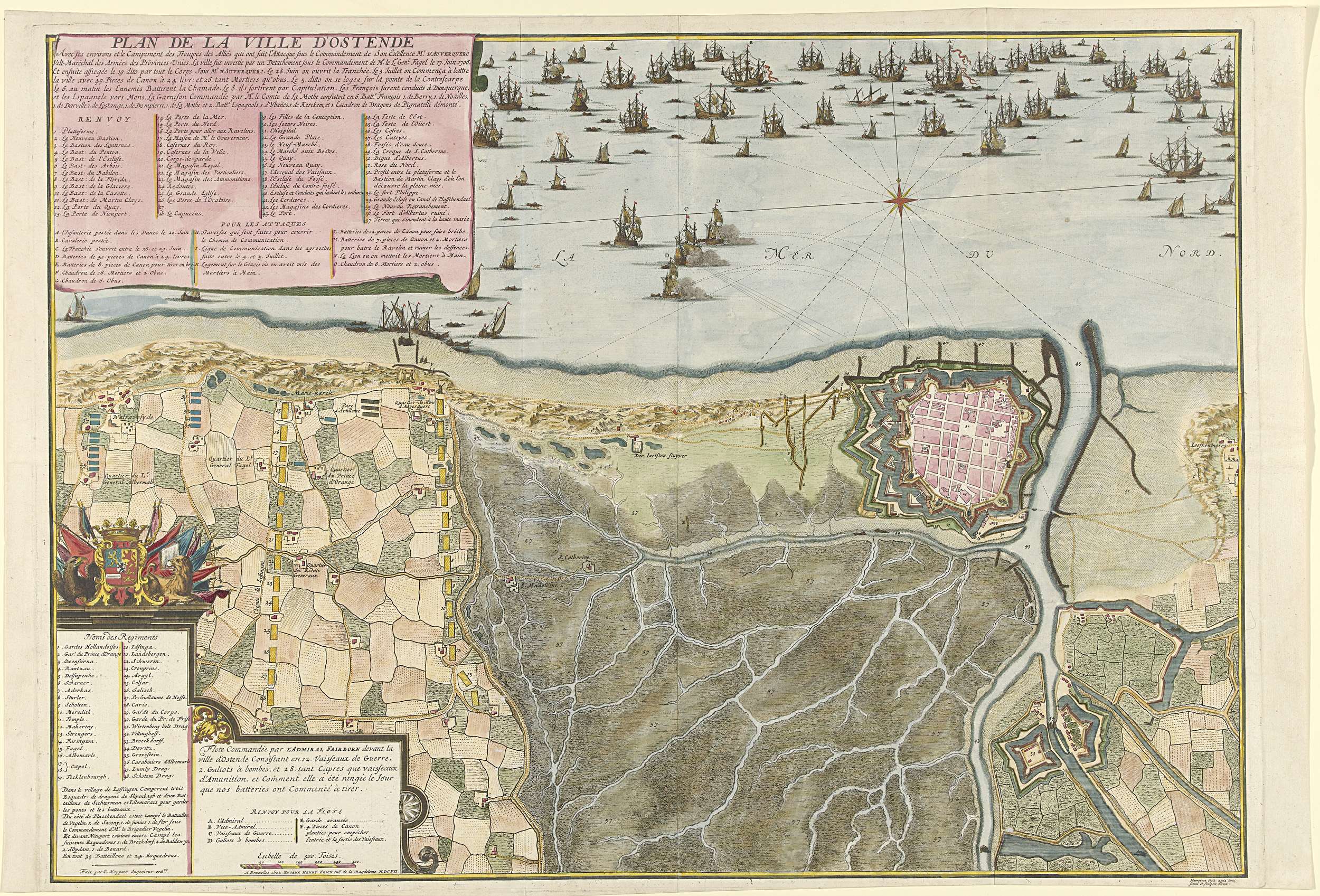 Kaart van het beleg van Oostende door de Geallieerden onder Hendrik van Nassau, heer van Ouwerkerk, belegerd vanaf 17 juni, ingenomen op 6 juli 1706. Linksboven een cartouche met de titel en de legenda 1-57 in het Frans. Linksonder een cartouche met een lijst van de regimenten die deel namen aan de belegering met bovenin ...