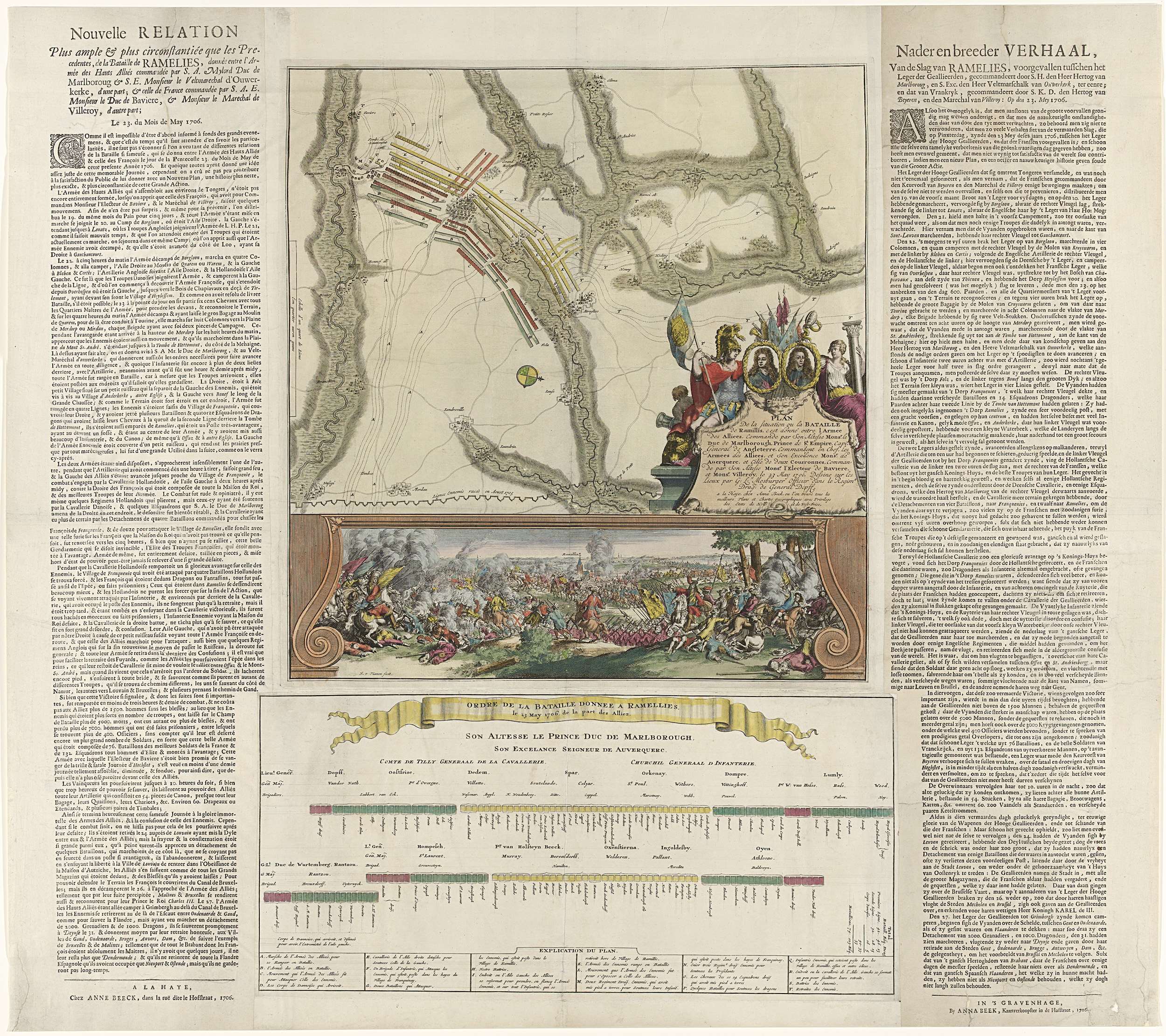 Plan en gezicht van de slag bij Ramillies tussen de Geallieerden onder de hertog van Marlborough en Hendrik van Nassau, heer van Ouwerkerk en de Fransen en de Beiersen, 23 mei 1706. Rechts een cartouche versierd met allegorische figuren en de portretten van Marlborough en Ouwerkerk. Onderaan is een blad geplakt met de slagorde van ...