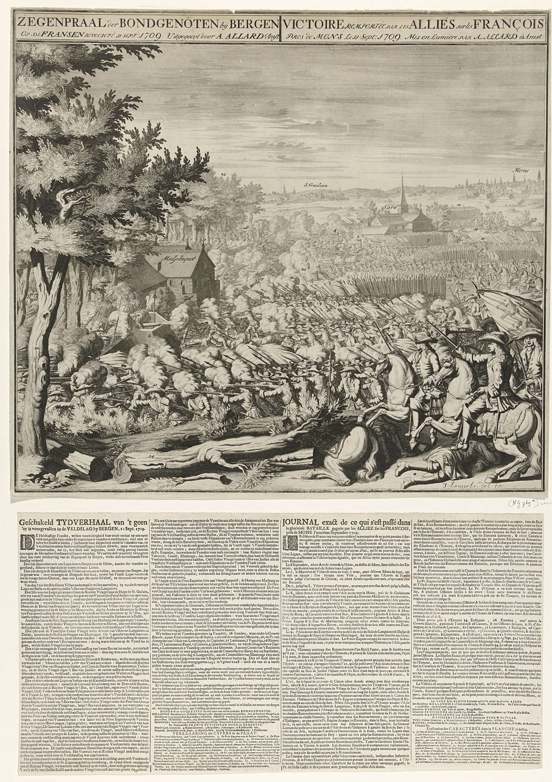 De slag bij Malplaquet tussen de Geallieerden en de Fransen, 11 september 1709. Prent met een voorstelling van de veldslag, op de voorgrond rechts de prins van Oranje te paard. Bij de prent een apart los blad met het relaas van de slag en de verklaring van de cijfers 1-26 in de voorstelling, in het ...