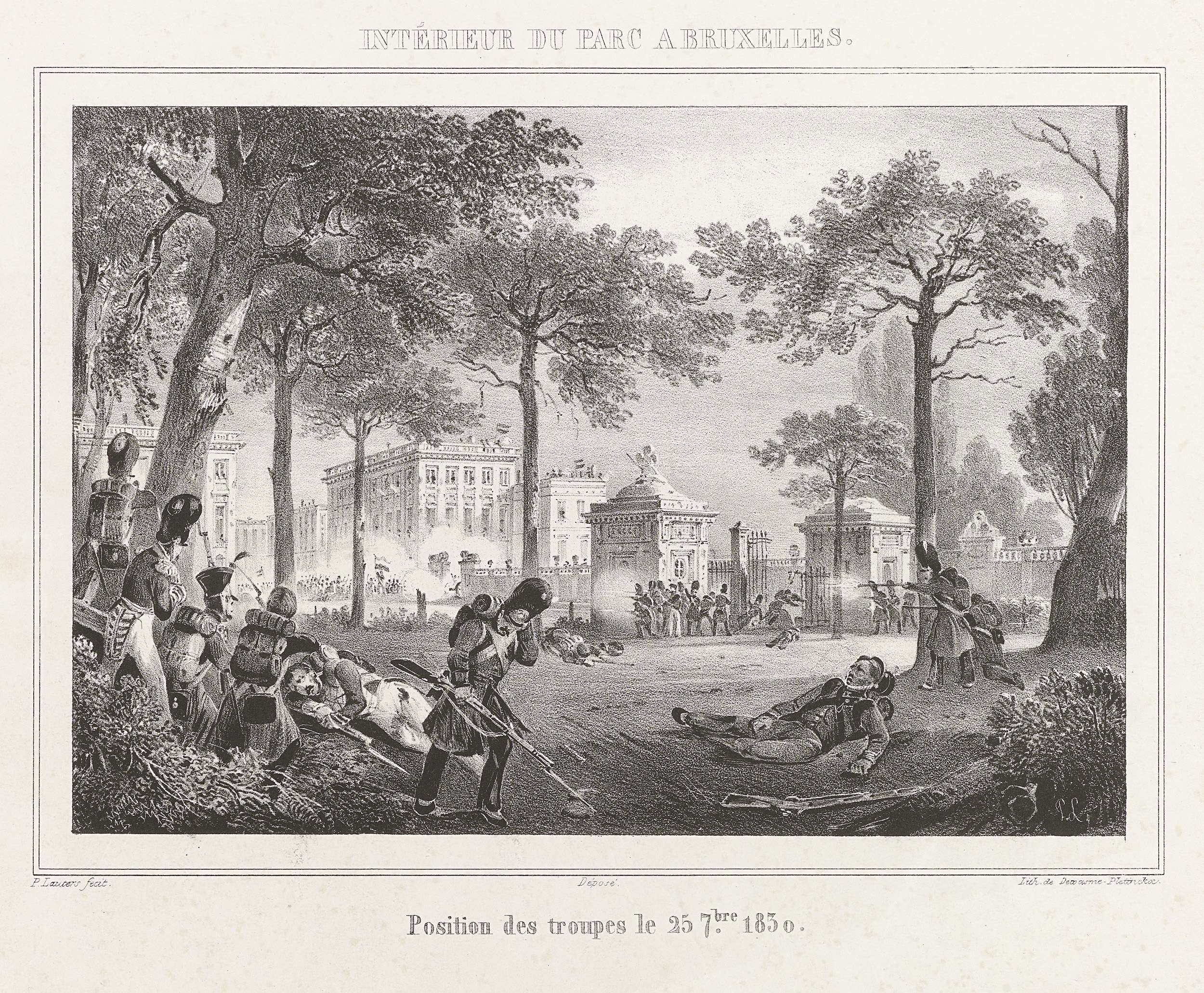 Gevechten bij het Koninklijk Paleis te Brussel, 25 september 1830. Onderdeel van een recueil met platen over de gebeurtenissen tijdens de Belgische Revolutie in Brussel, Antwerpen en andere steden in de periode 25 augustus 1830 tot 27 maart 1831.