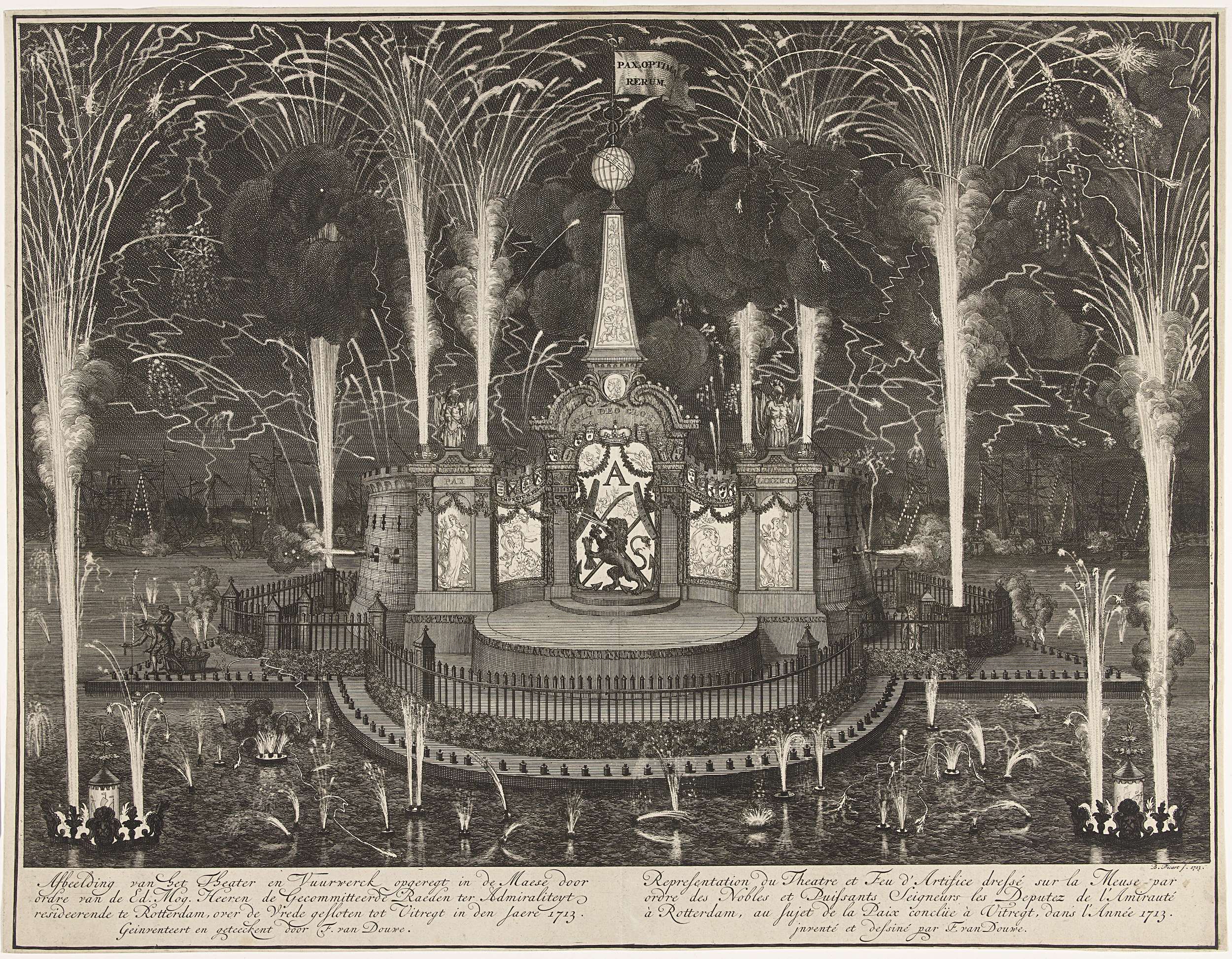Vuurwerk bij de viering van de Vrede van Utrecht te Rotterdam, 1713