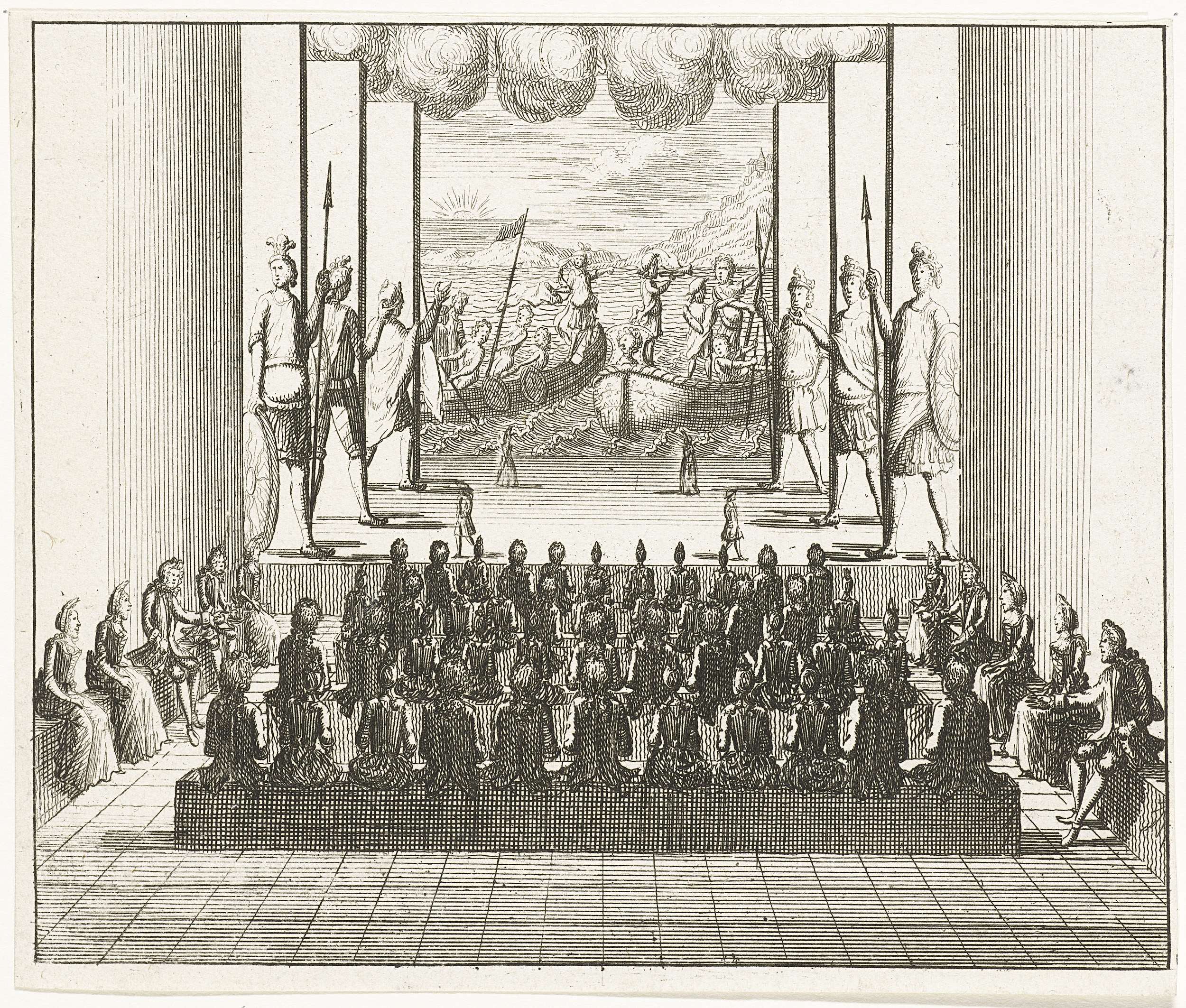 Toneelvoorstelling in een zaal, 1714. Onderdeel van een groep van twaalf illustraties van de feestelijkheden georganiseerd in Utrecht in 1714 door de Portugese graaf Joao Gomes da Silva conde de Tarouca ter ere van de geboorte van twee Portugese prinsjes van koning Johan V.
