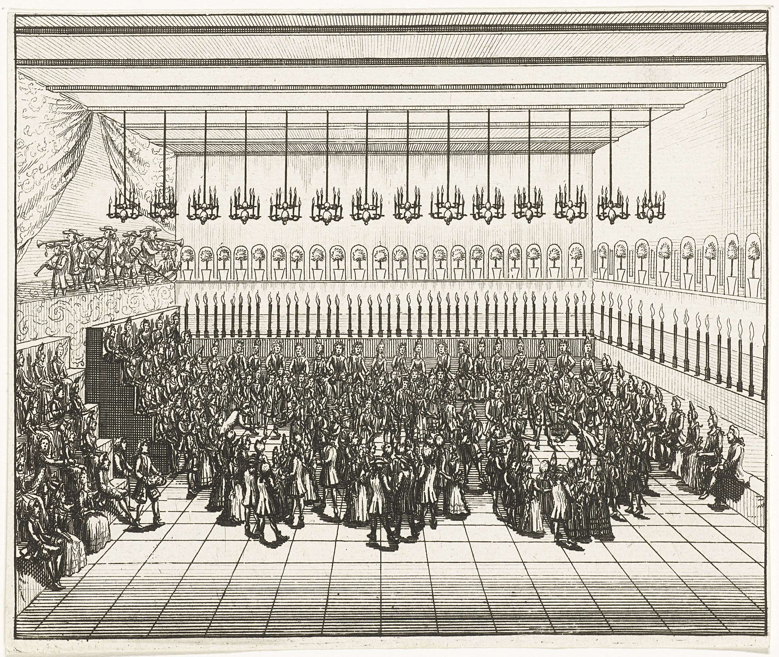 Een bal in een zaal versierd met kaarsen en potplanten, 1714. Onderdeel van een groep van twaalf illustraties van de feestelijkheden georganiseerd in Utrecht in 1714 door de Portugese graaf Joao Gomes da Silva conde de Tarouca ter ere van de geboorte van twee Portugese prinsjes van koning Johan V.