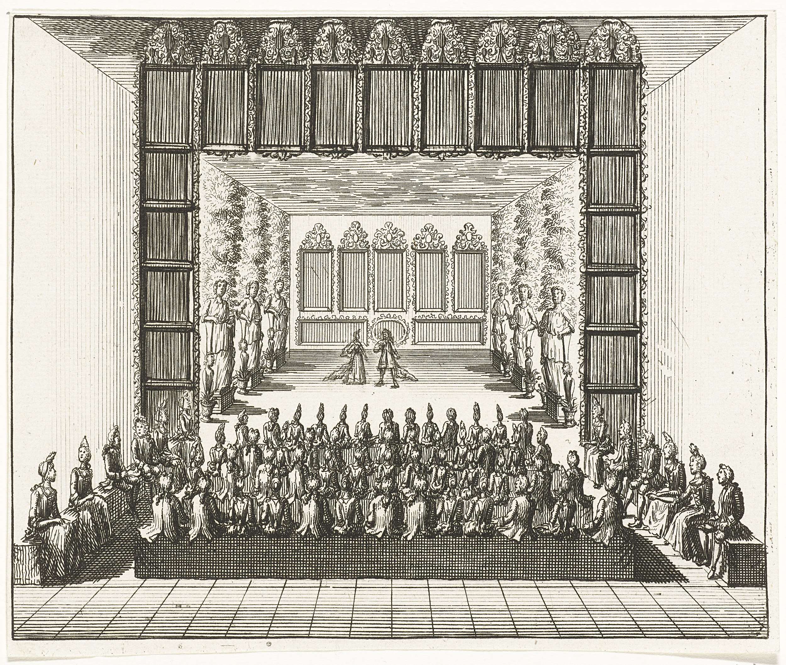 Toneelvoorstelling, 1714. Onderdeel van een groep van twaalf illustraties van de feestelijkheden georganiseerd in Utrecht in 1714 door de Portugese graaf Joao Gomes da Silva conde de Tarouca ter ere van de geboorte van twee Portugese prinsjes van koning Johan V.