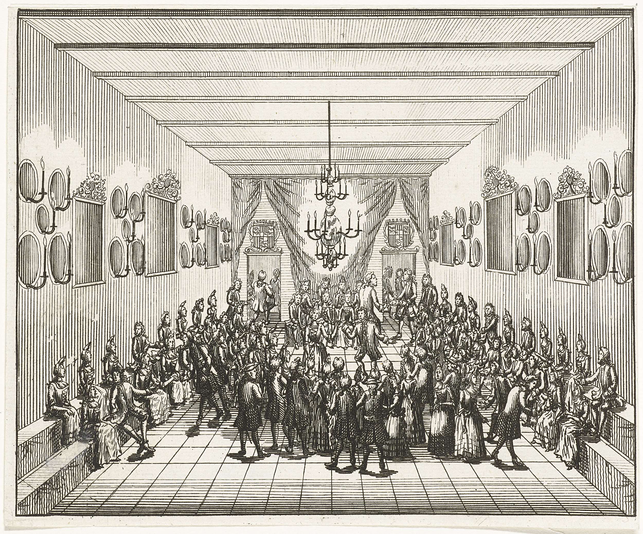 Een bal in een zaal met spiegels en kaarsen aan de wand, 1714. Onderdeel van een groep van twaalf illustraties van de feestelijkheden georganiseerd in Utrecht in 1714 door de Portugese graaf Joao Gomes da Silva conde de Tarouca ter ere van de geboorte van twee Portugese prinsjes van koning Johan V.