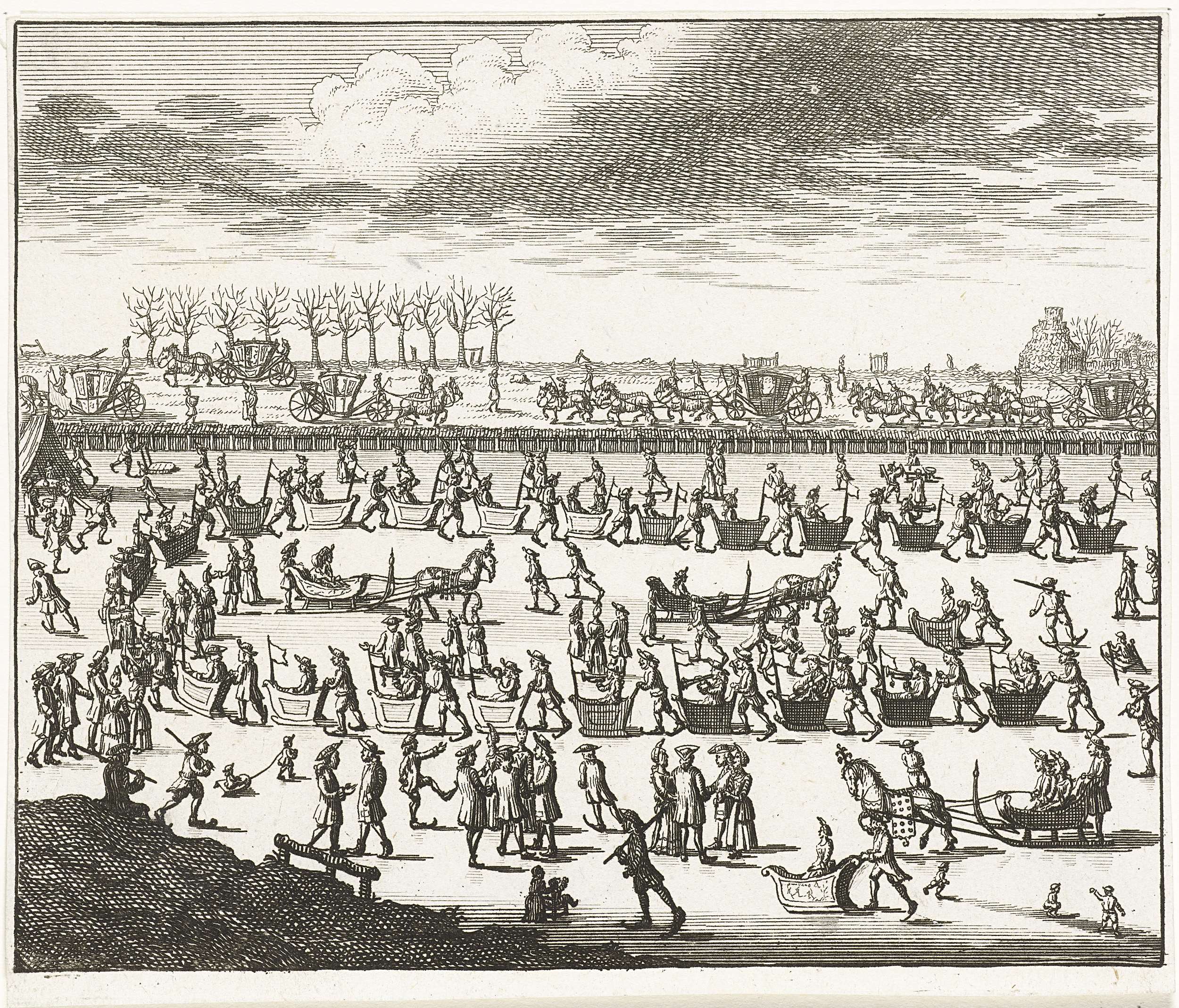 IJsvermaak, stoet van sledes met gasten op het ijs, 1714. Onderdeel van een groep van twaalf illustraties van de feestelijkheden georganiseerd in Utrecht in 1714 door de Portugese graaf Joao Gomes da Silva conde de Tarouca ter ere van de geboorte van twee Portugese prinsjes van koning Johan V.