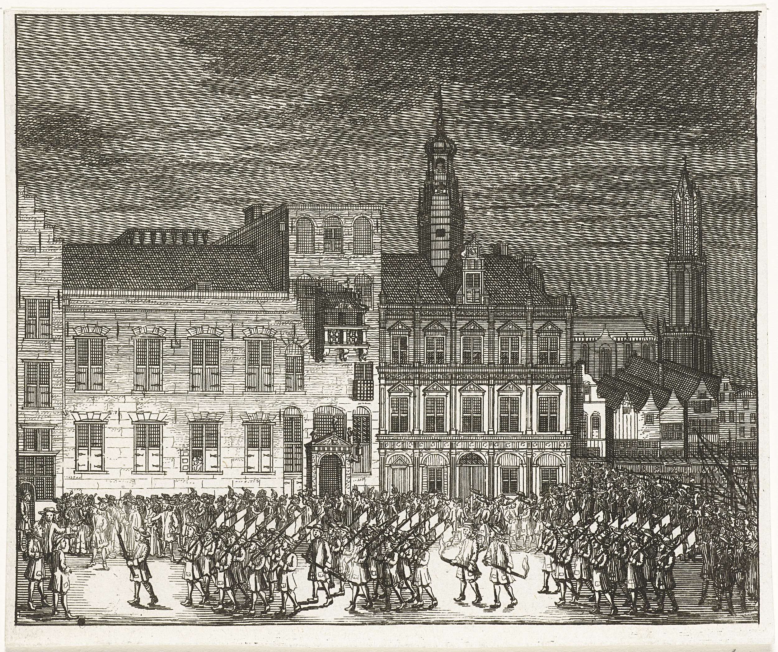 Optocht van de schutterij bij nacht, voor het stadhuis van Utrecht, 1714
