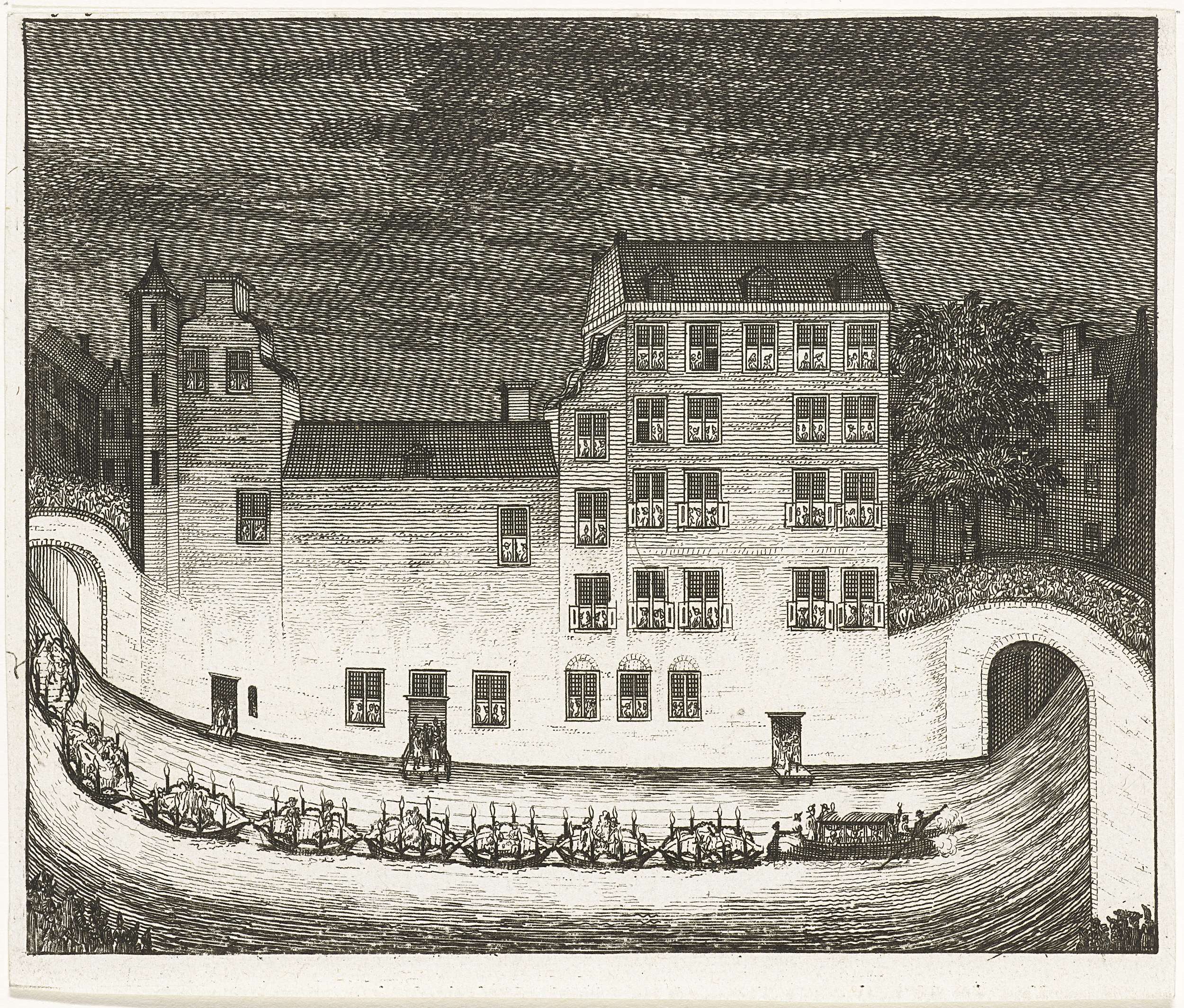 Avondlijke gondelvaart door de Nieuwe Gracht bij de Jansdam te Utrecht, 1714. Onderdeel van een groep van twaalf illustraties van de feestelijkheden georganiseerd in Utrecht in 1714 door de Portugese graaf Joao Gomes da Silva conde de Tarouca ter ere van de geboorte van twee Portugese prinsjes van koning Johan V.