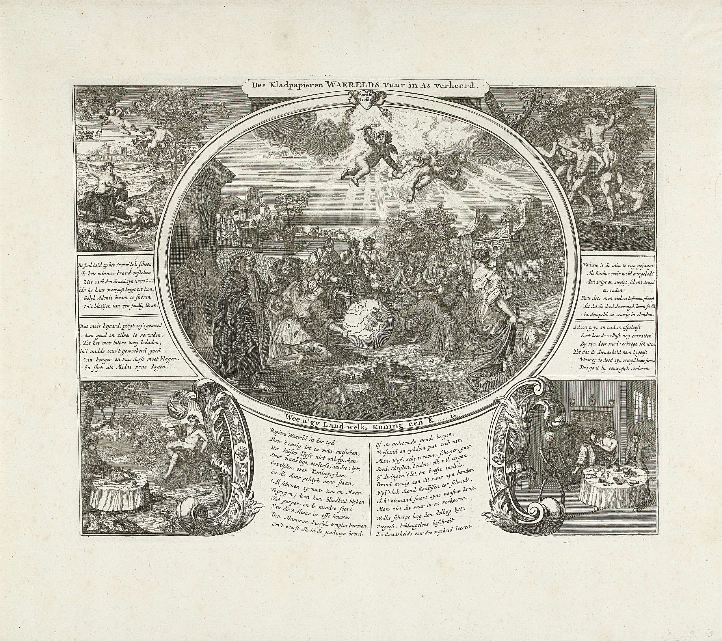 Centrale voorstelling met de wereldlijke en geestelijke vorsten en allerlei ander volk van arm tot rijk zijn verzameld om een wereldbol die vlam vat. In de vier hoeken illsutraties van de vluchtigheid van de wereldse genoegens. Met meerdere verzen. Prent 63 in de serie Het Groote Tafereel der Dwaasheid met spotprenten op de Windhandel of ...