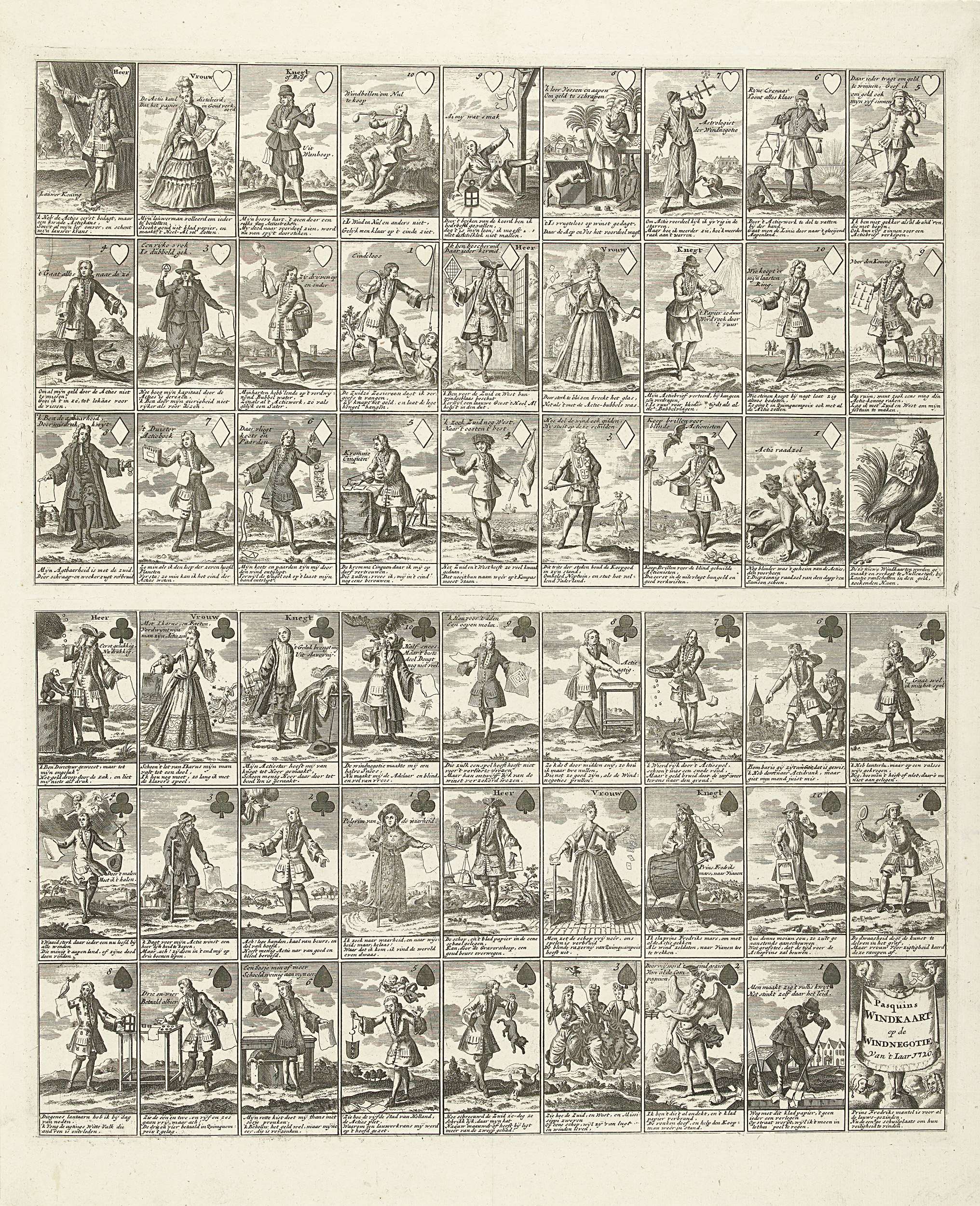 Pasquins Windkaart op de Windnegotie van 1720. Blad met een compleet spel van 52 speelkaarten, elke kaart met een voorstelling en versje gerelateerd aan de windhandel. Door Muller beschreven als een latere druk van prent 65 in de serie Tafereel der Dwaasheid met spotprenten op de Windhandel of Actiehandel van 1720, het betreft echter een ...