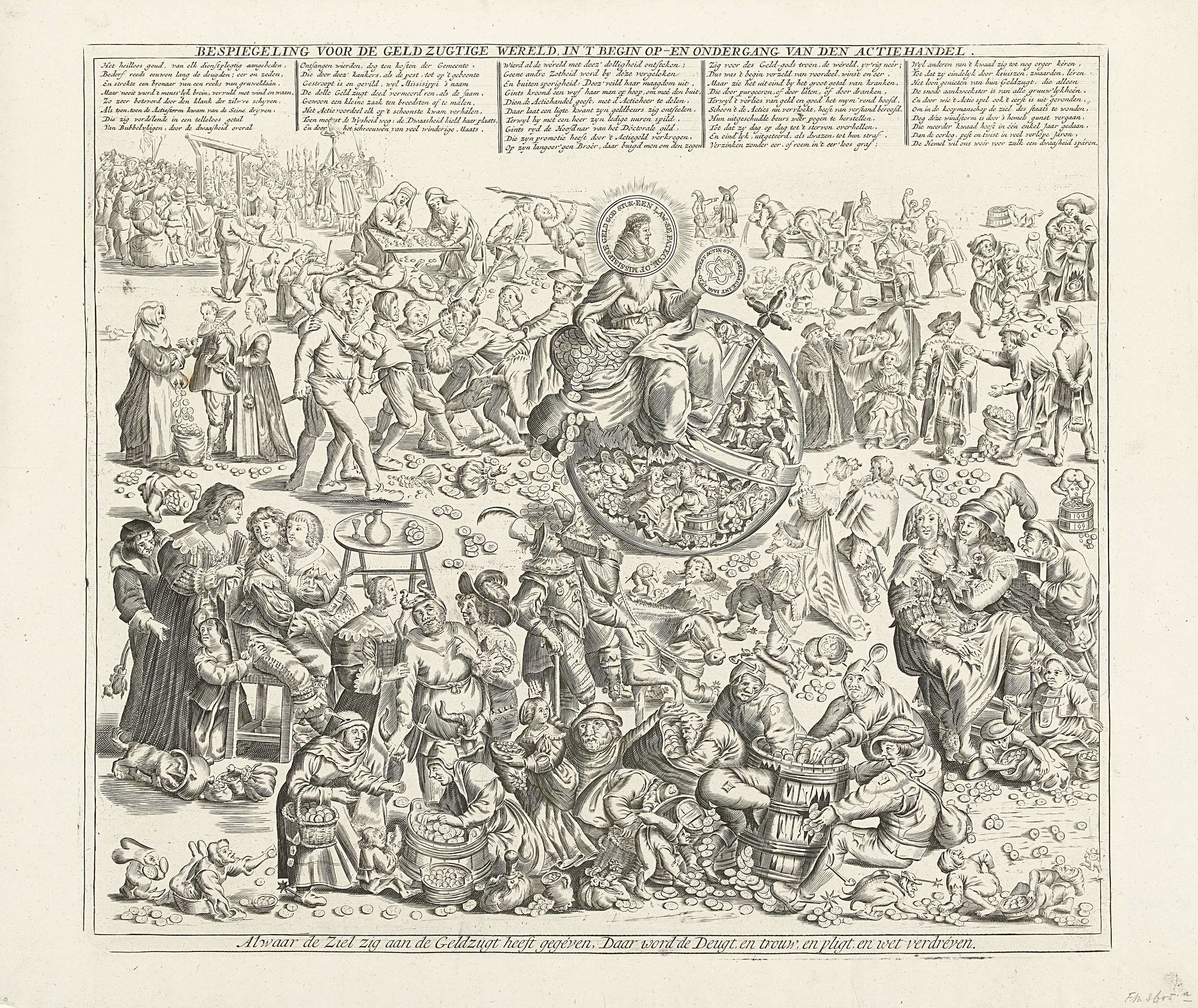 Allegorie op de geldzuchtige wereld, of de op- en ondergang van de actiehandel. Centraal een figuur zittend op een wereldbol met een geldstuk van John Law als hoofd. De voorstelling is verder gevuld met allerlei voorbeelden van de dwaasheid van de mens in zijn zucht naar geld, vechtpartijen, kwakzalvers, boeren etc. Kopie naar een oude ...