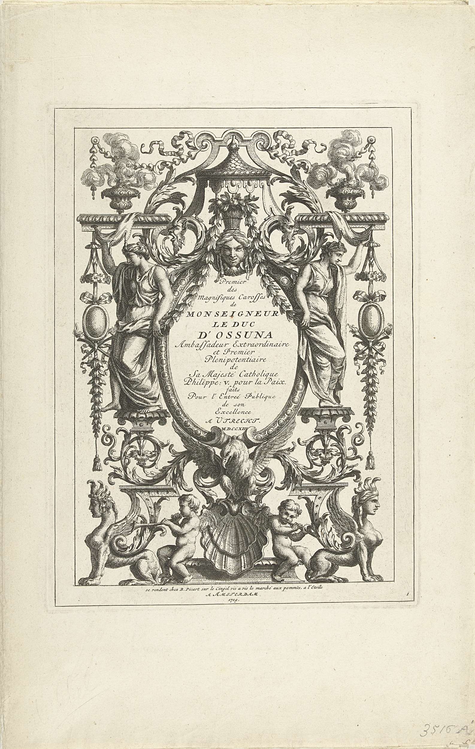 Titel in een rijk versierde ornamentele omlijsting met twee vrouwenfiguren, engelen, sfinxen en bladwerk. Titelprent voor de serie platen van de statiekoets van de Spaanse gezant de hertog van Ossuna, gebruikt bij zijn openbare intocht in Utrecht voor de vredesonderhandelingen in 1713. Genummerd rechtsonder: 1.