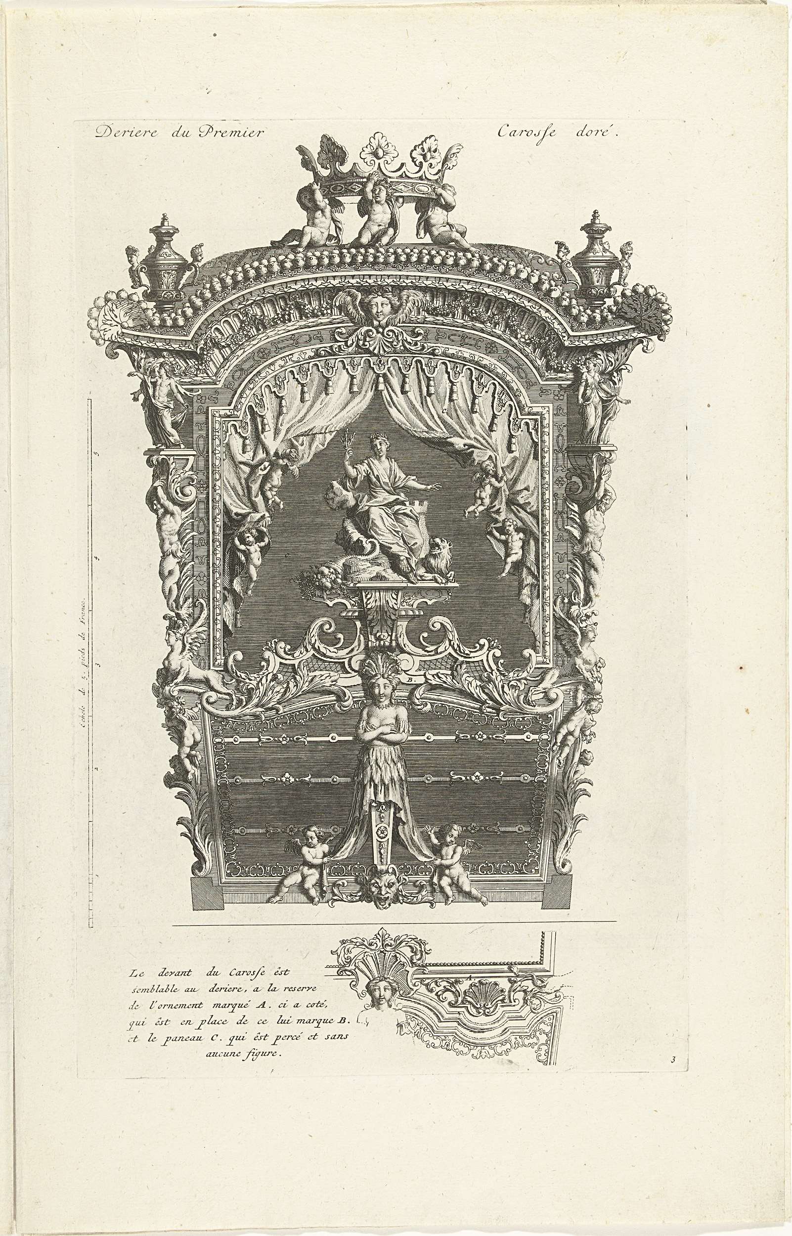 Achterkant van de gouden koets met een paneel waarop een allegorische figuur van de Overvloed die Vrede brengt. Onderdeel van een serie van 7 platen met de statiekoets van de Spaanse gezant de hertog van Ossuna, gebruikt bij zijn openbare intocht in Utrecht voor de vredesonderhandelingen in 1713. Genummerd rechtsonder: 3.