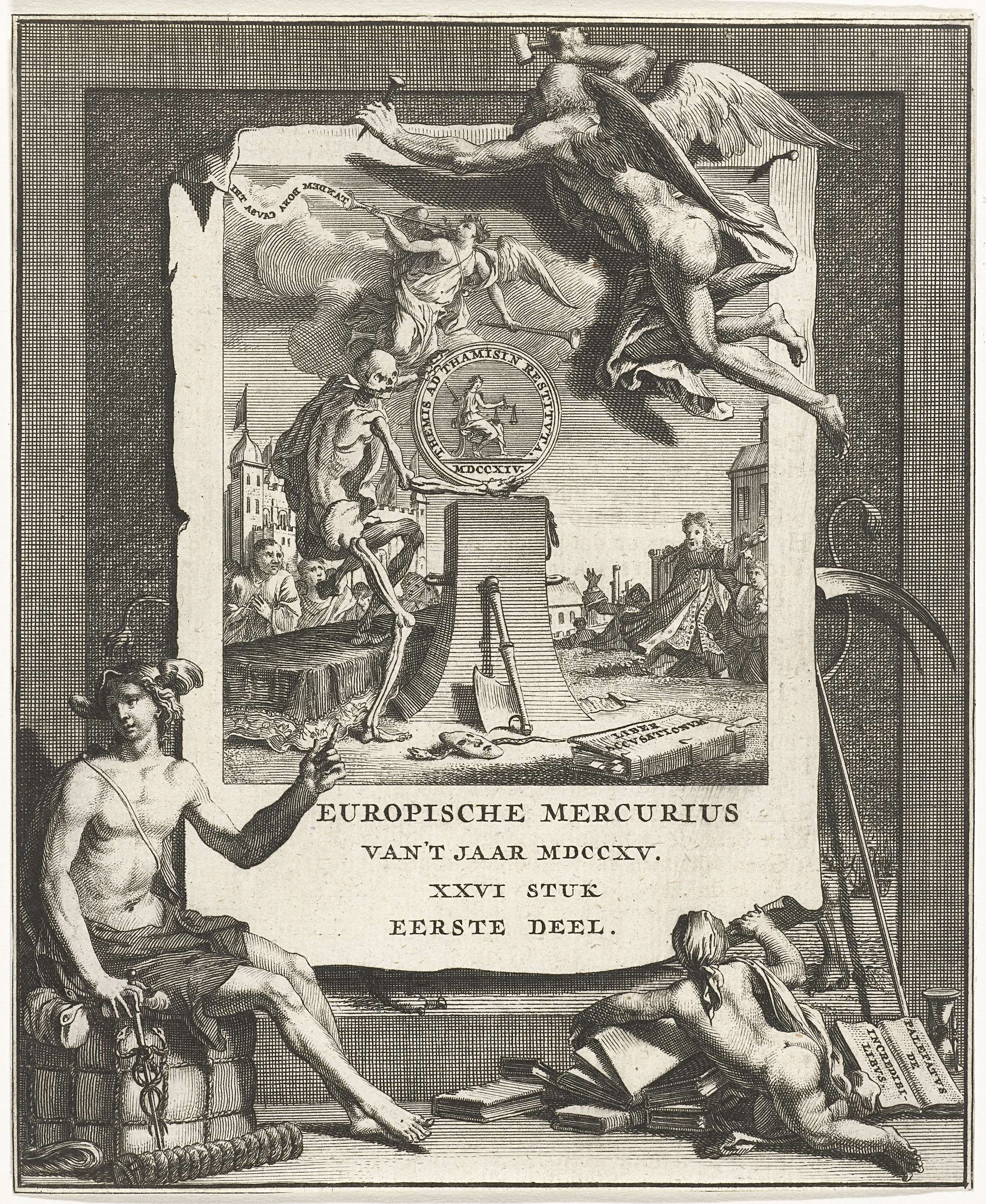 Titelpagina voor de Europische Mercurius, dl. XXVI, eerste deel van 1715. Mercurius wijst naar een blad dat door de Tijd wordt opgehangen waarop een voorstelling met een allegorie op de dood van Lodewijk XIV.