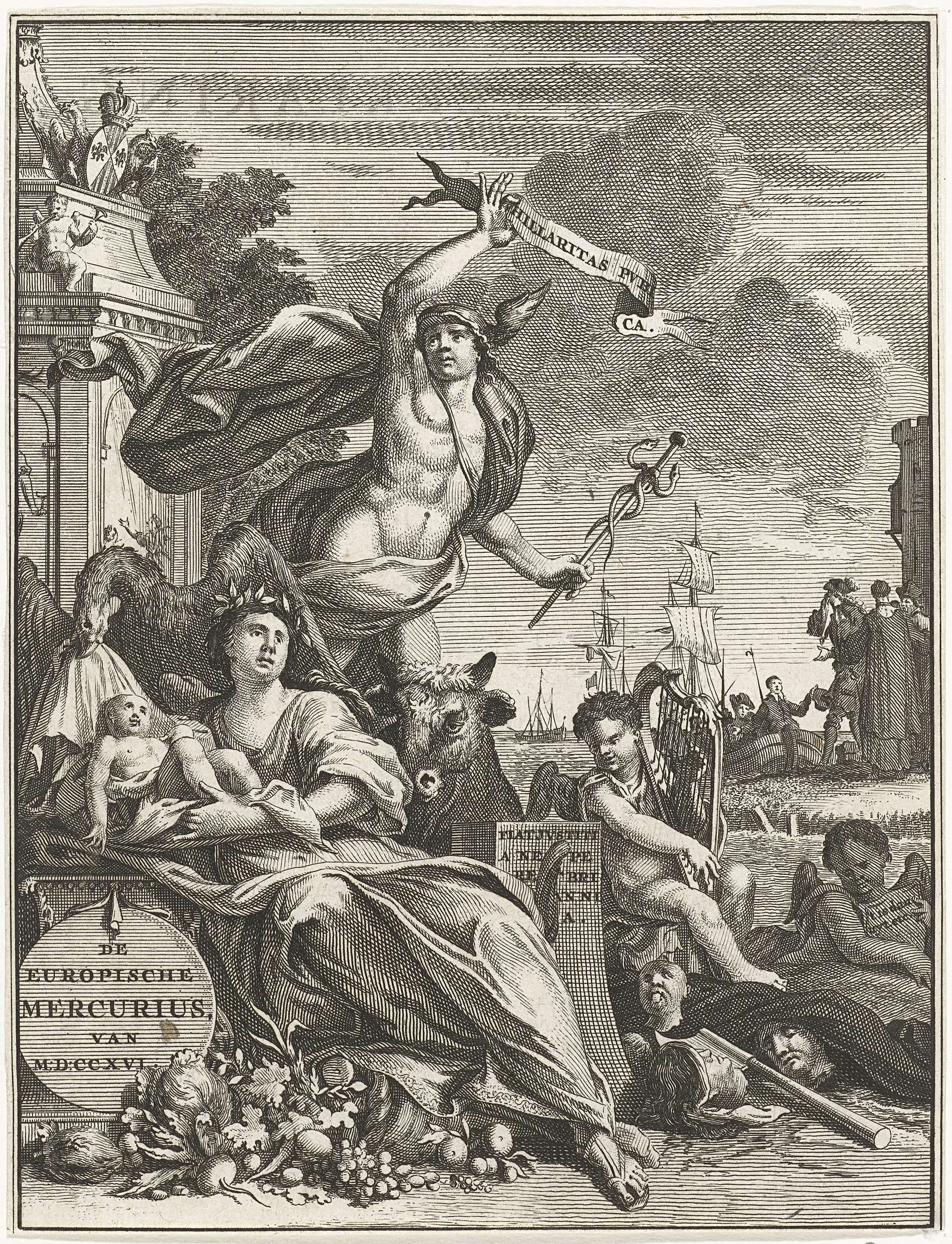 Titelpagina voor de Europische Mercurius, dl. XXVII van 1716. Mercurius houdt een banderol in de lucht, links een treurende Europa met de in 1716 geboren en overleden Leopold Johan, kind van de Duitse keizer Karel VI.