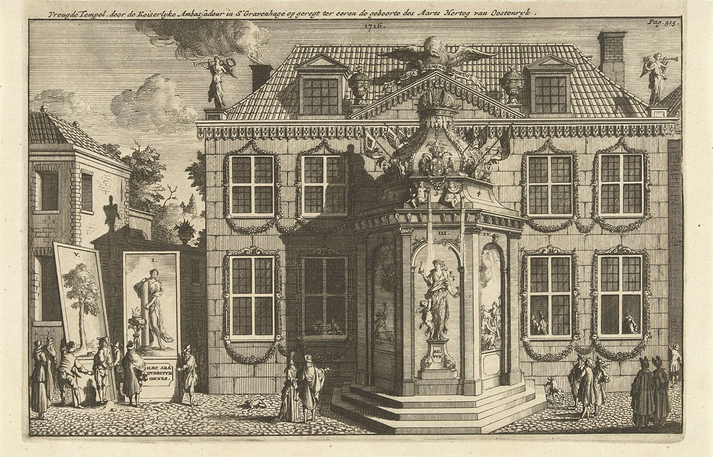 Tempel opgericht voor het huis van de keizerlijke ambassadeur te Den Haag ter ere van de geboorte van aartshertog Leopold Johan, 1716