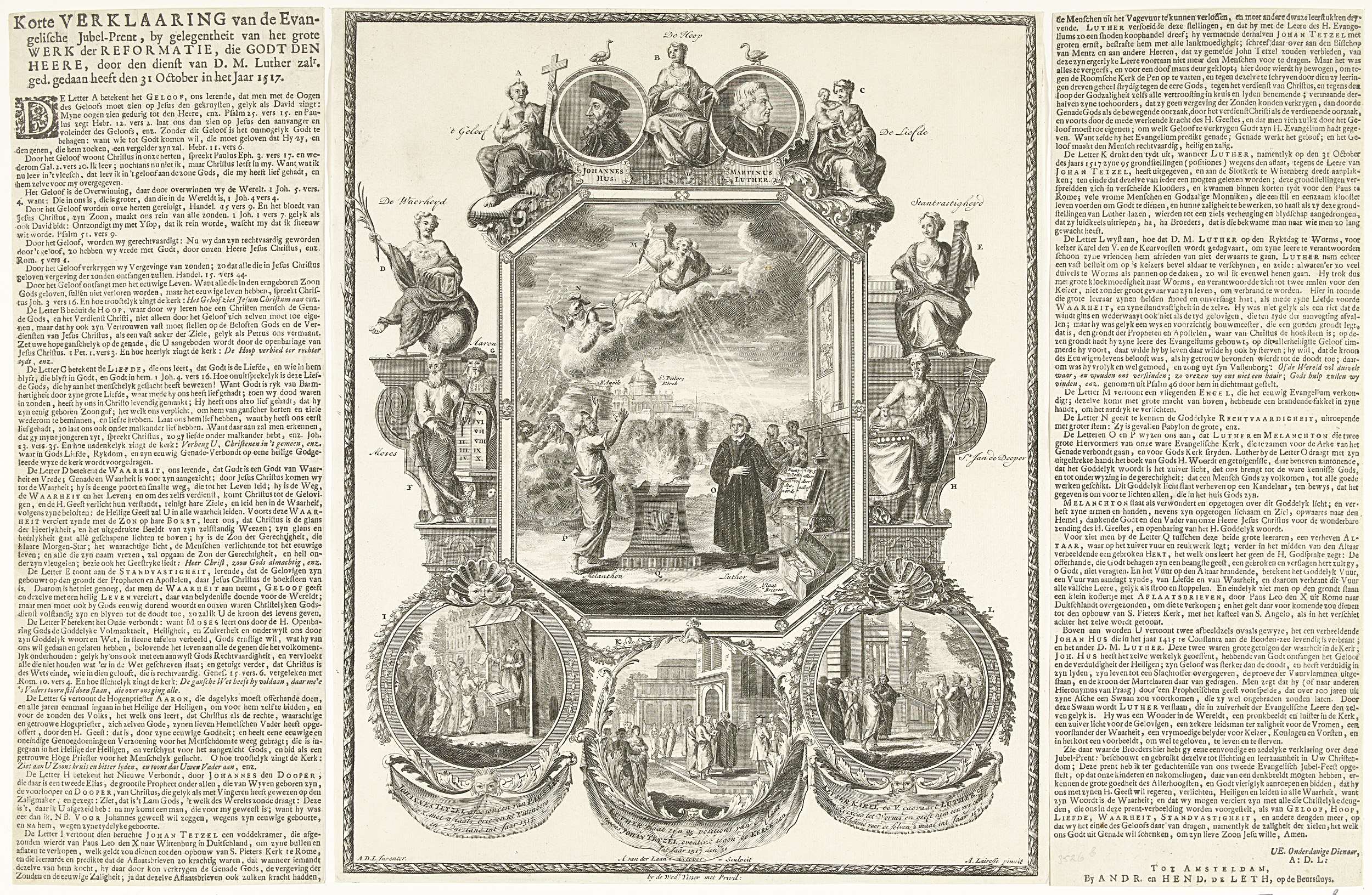 Evangelische jubelprent bij de viering van het tweede eeuwfeest van de reformatie, 31 oktober 1717. Centrale voorstelling met Luther en Melanchton bij een altaar waarop het Goddelijke Vuur de Valse Leer verbrandt, in een omlijsting versierd met portretten van Hus en Luther, drie scènes uit het leven van Luther, bijbelse leiders en de personificaties van ...