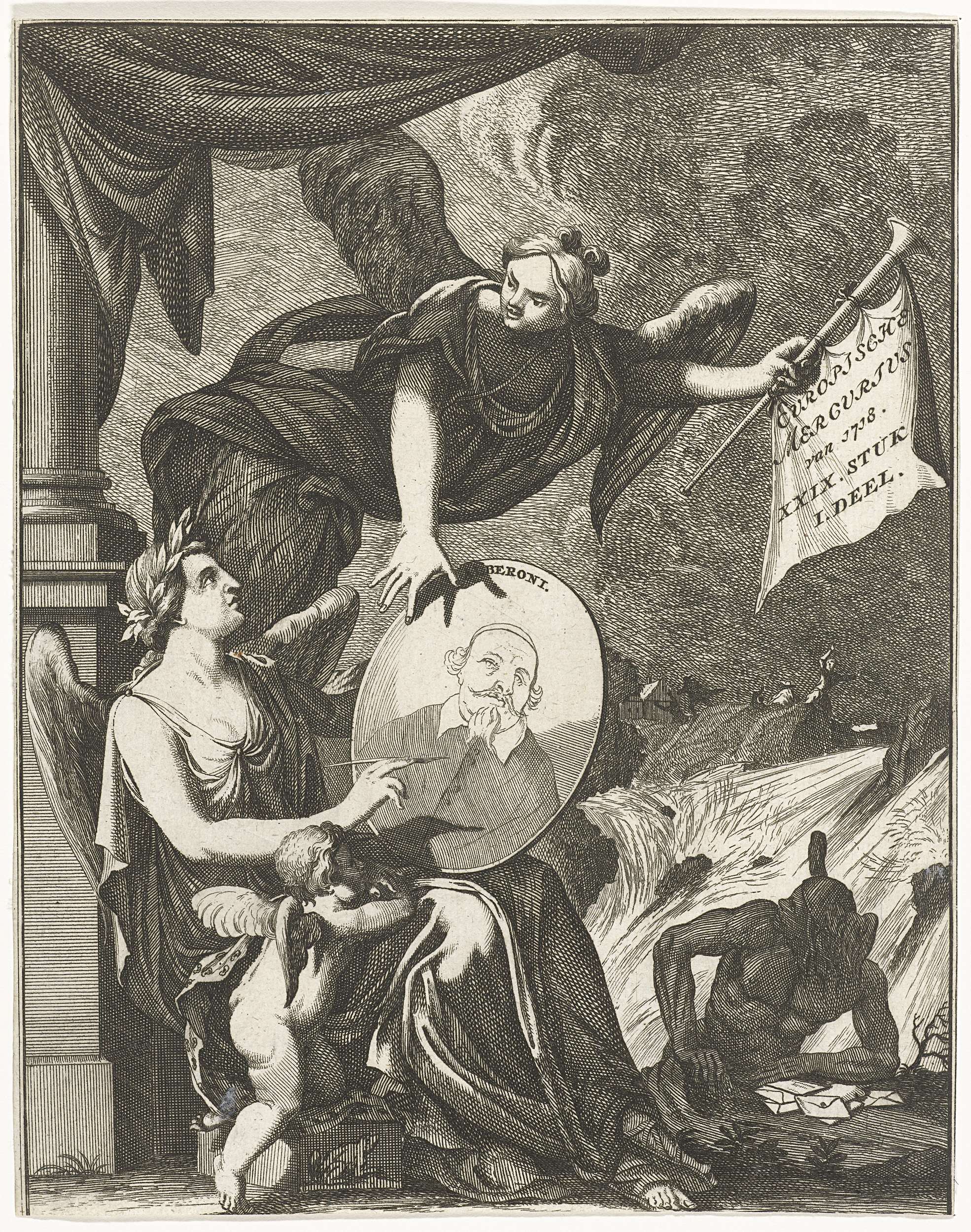 Titelpagina voor de Europische Mercurius, dl. XXIX van 1718. De Geschiedenis wil het portret van kardinaal Giulio Alberoni schilderen maar wordt tegengehouden door de Faam. Op de achtergrond overstromingen.