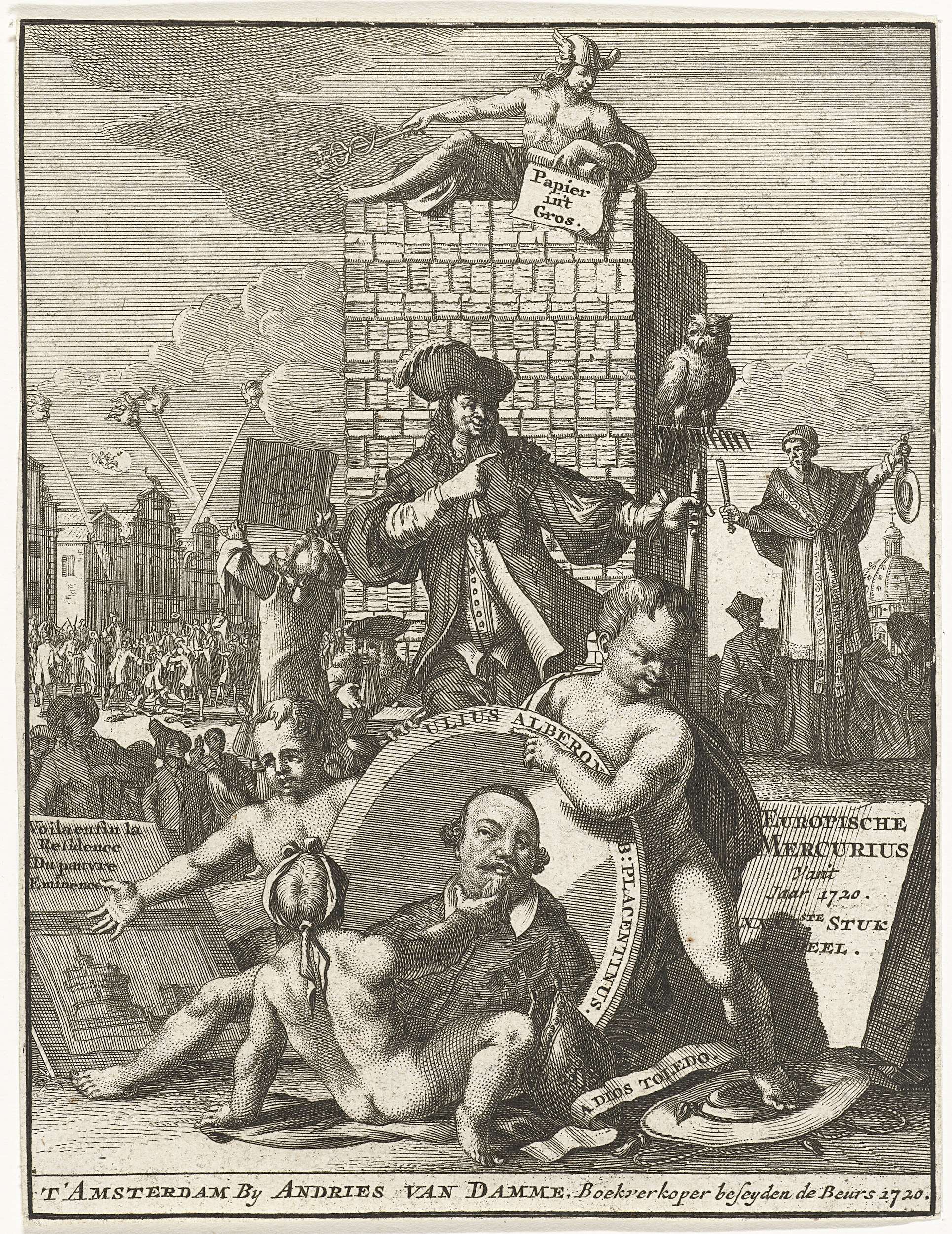 Titelpagina voor de Europische Mercurius, dl. XXXI over het jaar 1720. Op de voorgrond een portret van kardinaal Giulio Alberone. De bespotting van dit portret verwijst naar de val en verbanning van de kardinaal uit Spanje in december 1719. Op de achtergrond Mercurius gezeten op een enorme stapel papier.