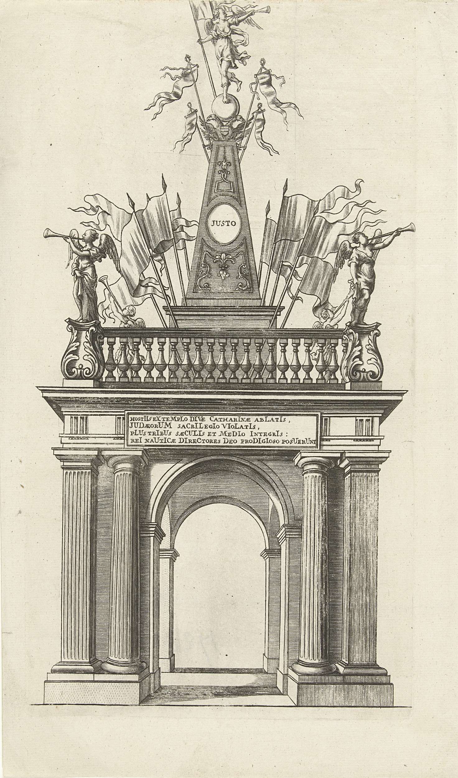 Triomfboog met vaandels en Justo, opgericht in 1720 op de Place de la Chancellerie te Brussel ter gelegenheid van het 350-jarige jubileum van het Heilig Sacrament van het Wonder uit 1370.